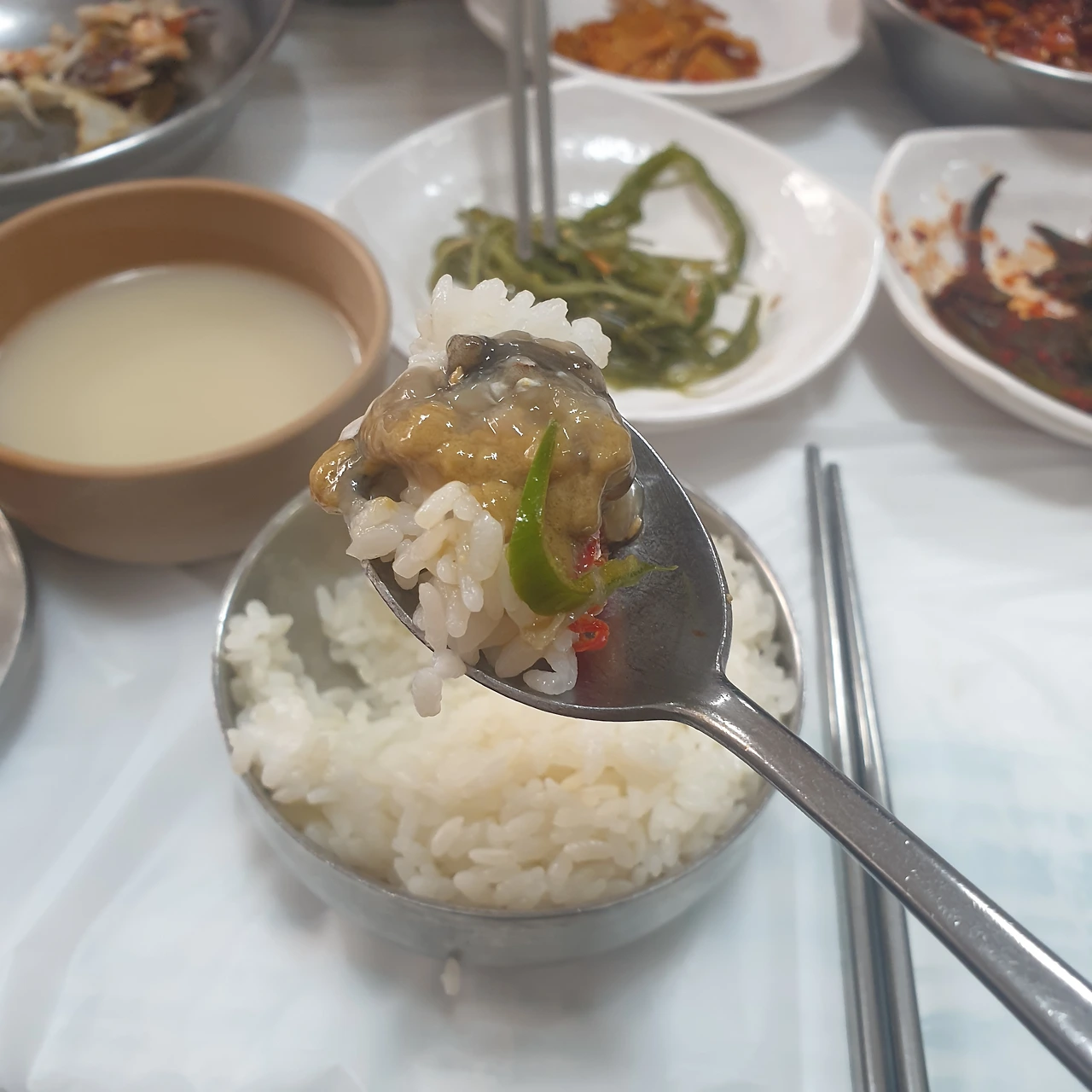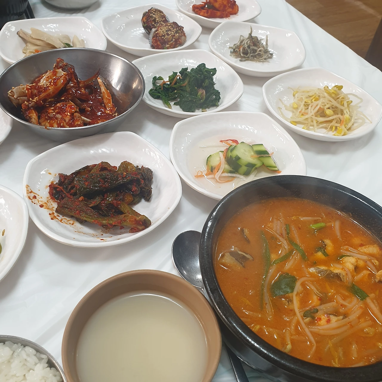 금세 여러 가지 찬들로 한 상이 차려진다. 장어탕에 인당 4천 원을 더해 간장 돌게장과 양념 돌게장이 포함된 정식이다.