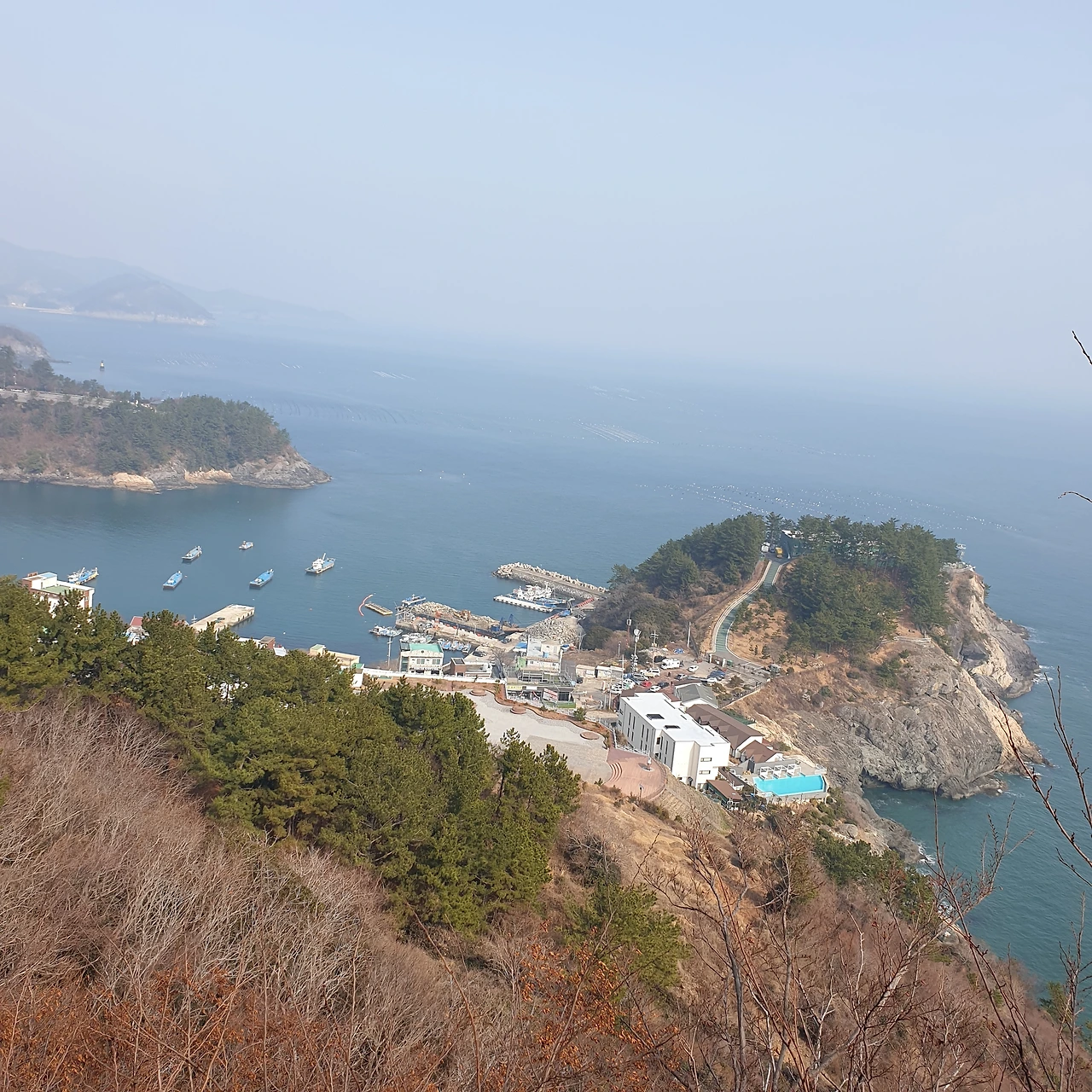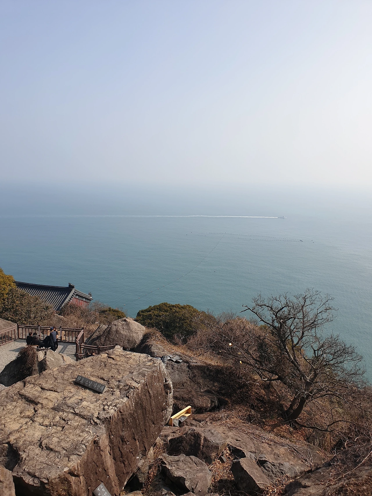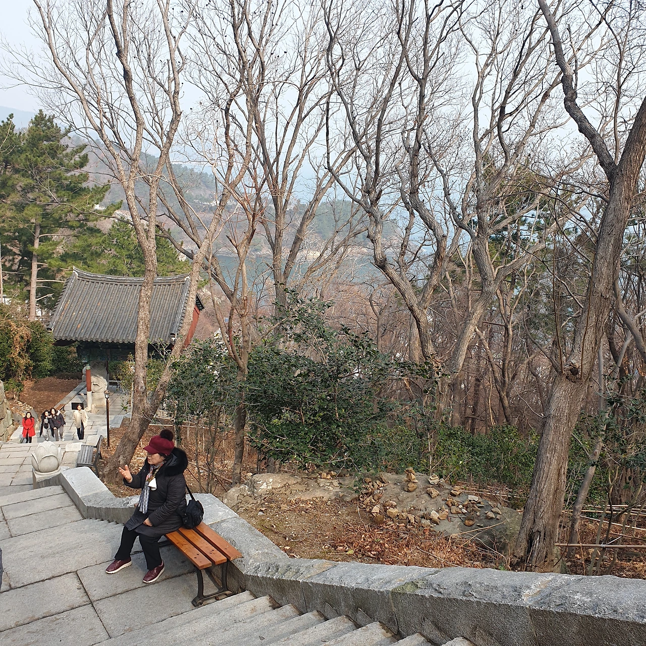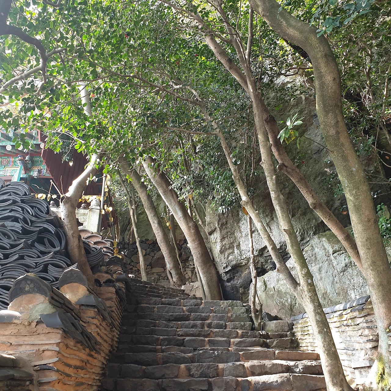 일주문을 지나 조금 더 계단을 올라 다리가 뻐근하다 싶을 즈음 벤치가 자리하고 있다. 앞서 가시던 할머님들이 ‘쉬라고 놓여있는 게야’라며 앉아 담소를 나누신다. 꽤 높이 오른 듯 오른쪽으로 보이는 바다 풍경을 바라보며 천천히 지나가는데 할머님들의 대화가 들린다.