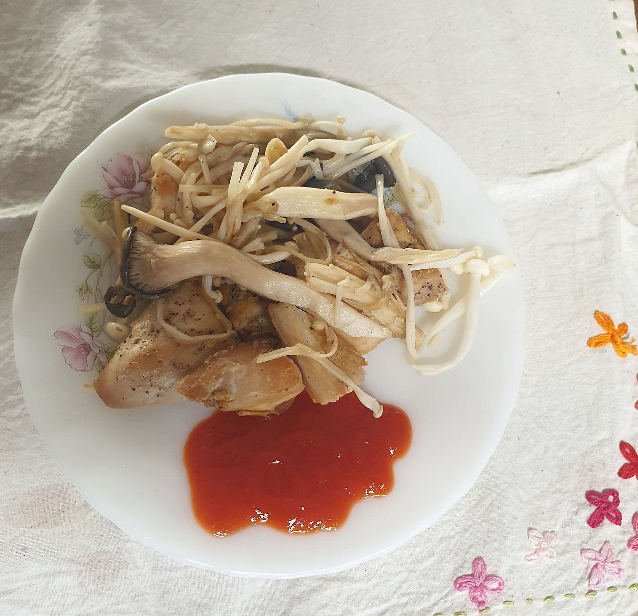 곧 푸슉~하는 소리와 함께 달큰한 쌀밥의 냄새가 풍기지만, 애써 참고 아들이 먹다 남긴 닭가슴살 조각에 자투리 버섯을 넣어 볶아 접시에 담고, 스리라차 소스를 뿌려 첫 식사를 시작했다.