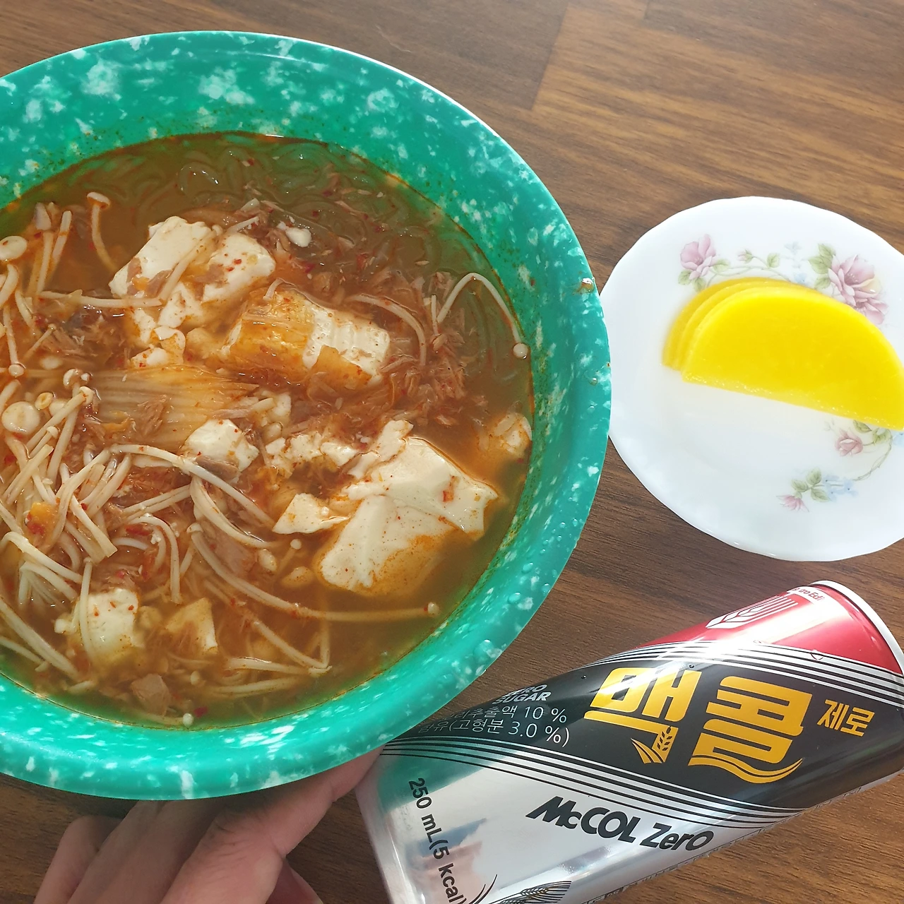 황태껍질로는 채워지지 않는 허기에 천사채당면과 팽이버섯 계란을 섞어 일명 계란만두라 불리는 음식을 만들어 무알콜맥주 소맥으로 저녁을 마감.