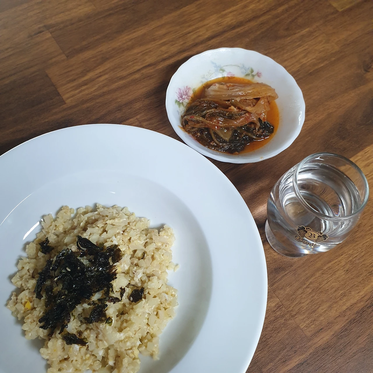 월요일은 밥이 당겨, 들기름을 티스푼 하나 정도 두르고 콜리플라워라이스에 계란을 넣고 볶음밥을 만들었다. 예쁜 접시에 담아 김을 얹고 김치를 곁들이니 충분하다.