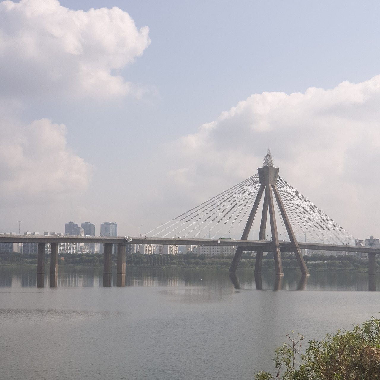 저 멀리 롯데타워의 모습이 보인다. 아 강남이구나. 여긴 강북이지만 강남쯤에 왔구나 생각한다. 성화를 형상화한 올림픽대교의 모습도 보인다. 저 횃불 모양의 조형물을 설치하던 헬기가 추락해 탑승해 계시던 분들이 돌아가셨단 얘기를 들은 생각이 난다. 올림픽대교는 계속 저 자리에서 그분들을 떠올리게 하고 추모하게 하겠지.