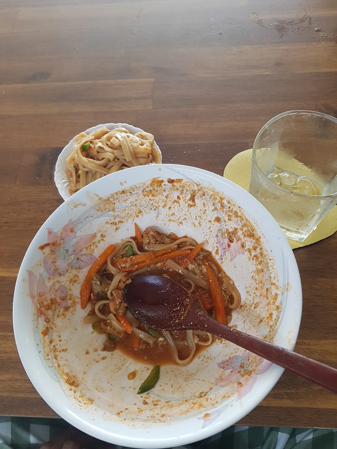 냉동실을 뒤져 꽃게와 황태를 꺼내 국물을 우리고 호박과 당근 양파를 넣고, 칼칼한 고추장에