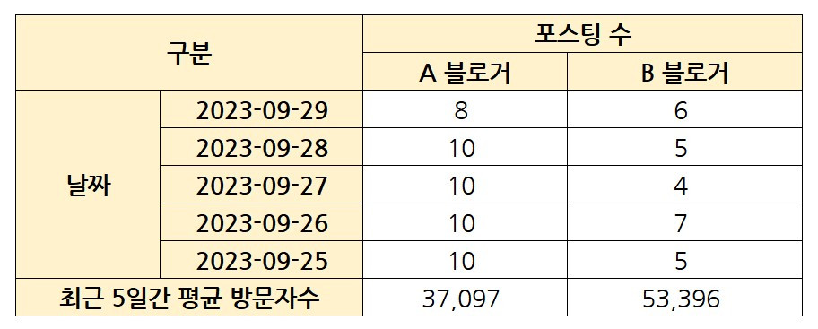 어느 블로거인지 밝히진 않고 A/B라고 칭했는데,(더 조사할 수 있으나.. 레이니즘 다음인 귀차니즘..으로)이 두분의 5일간 방문자 수를 봐 그리고 포스팅 수를 보면.. 정말 꾸준하시지?... 두분다 인플루언서이시니까 토픽 발행량은 빠지고 블로그 포스팅만 카운팅 한건데... 봐봐... 여전히 나의 게으름에 무릎을 탁 치고 나올 수 밖에 없는거 같아.... 정말 저렇게 되야 한달에 월 500 넘게 벌 수 있는거거든... 숫자는 그짓말을 안하니까 말이야...
