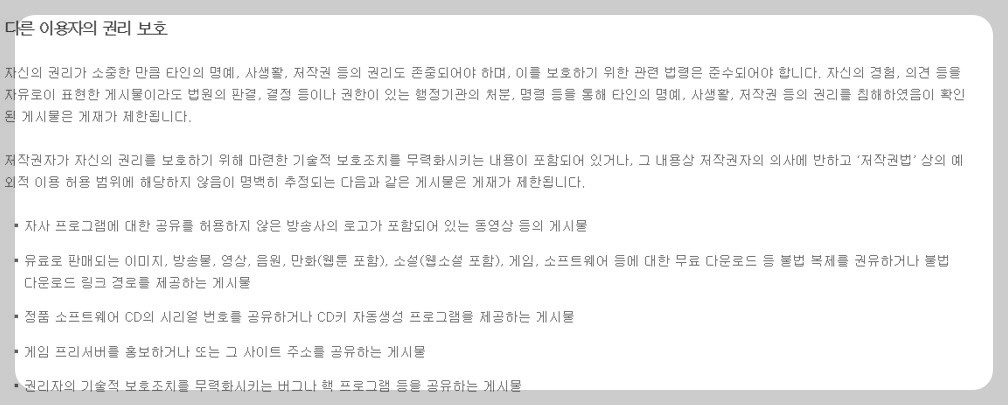 네이버가 하지 말아주세요 라고 하는 첫번쨰는 바로 다른 사용자의 권리 보호야. 즉, 지적 재산권 등에 대한 보호조치라고 할 수 있지. 여기서 많이들 블로그 운영하면서 실수하는게 TV 프로그램 캡쳐 거든 진짜 이거 잘못 걸리면 네이버 패널티는 두번째고 관계사로부터 저작권 위반 딱지랑 벌금 받을지 합의를 할지 결정하게 되니까! 진짜로 방송사 로고가 포함된 화면은 캡처 하지 않도록 해요 우리!^^
