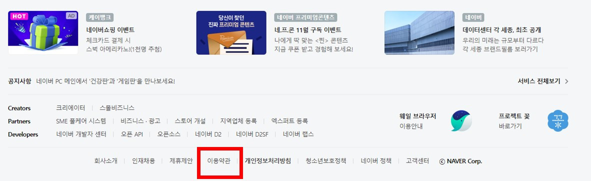 네이버 메인페이지 제일 밑에 가보면 "이용약관" 이라고 표시된 곳이 있어 바로 우리가 앞으로 써내려갈 블로그의 이용 수칙과 같은 매뉴얼이 함께 포함된 곳이지. (그렇습니다. 네이버느님은 정말 친절하시다능)