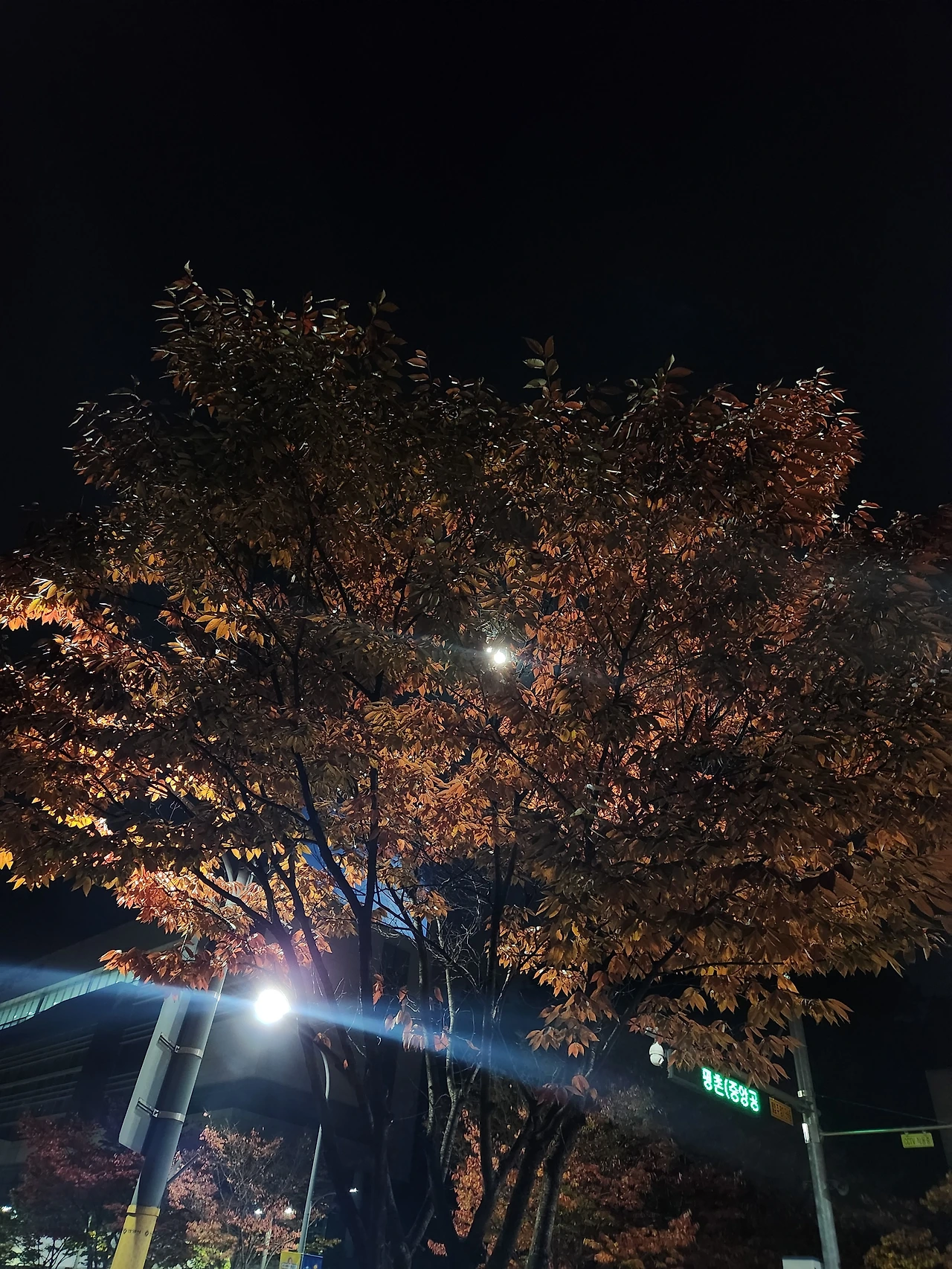 러닝을 하는 길에 단풍나무와 가로등이 있다.