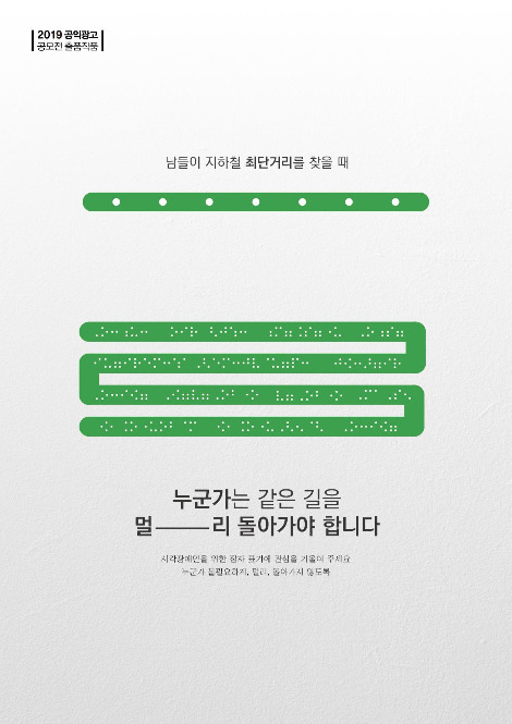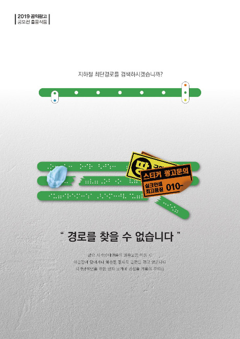 이후 끝없는 수정의 굴레를 거쳐 완성본이 나왔다. 훼손된 점자를 표현하기 위해 스티커와 껌을 붙였다. 환승 표시의 색깔과 껌, 스티커의 색깔을 매치시켰는데 눈에 띄진 않는 것 같다. 직설적인 화법은 아니지만 내비게이션을 연상시키는 카피를 통해 시각장애인들의 불편한 상황을 부각했다. 비시각장애인이 아무 생각 없이 최단경로를 검색하는 동안 시각장애인은 (훼손된 점자로 인해) 경로를 찾을 수조차 없는 상황에 놓인다는 거다. 비시각장애인도 그 상황을 이해하고 관심을 가지길 바랐다.