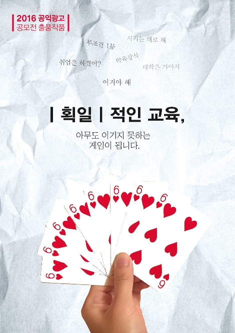 메시지가 너무 어렵다는 건 처음 출품했던 광고에서 큰 문제였다. 맹목적으로 경쟁에 집착하는 교육의 획일성을 비판하는 내용이었지만, 보자마자 바로 파악하기엔 애매모호했다. 조금 더 쉽게, 간단하고 간결하게, 그러나 임팩트 있게! 여전히 어려운 일이지만 다음번엔 조금 더 잘할 수 있을 것 같다. 수상의 기쁨도 좋지만, 공모전으로 배우고 점차 나아지는 것도 뿌듯한 일이다.