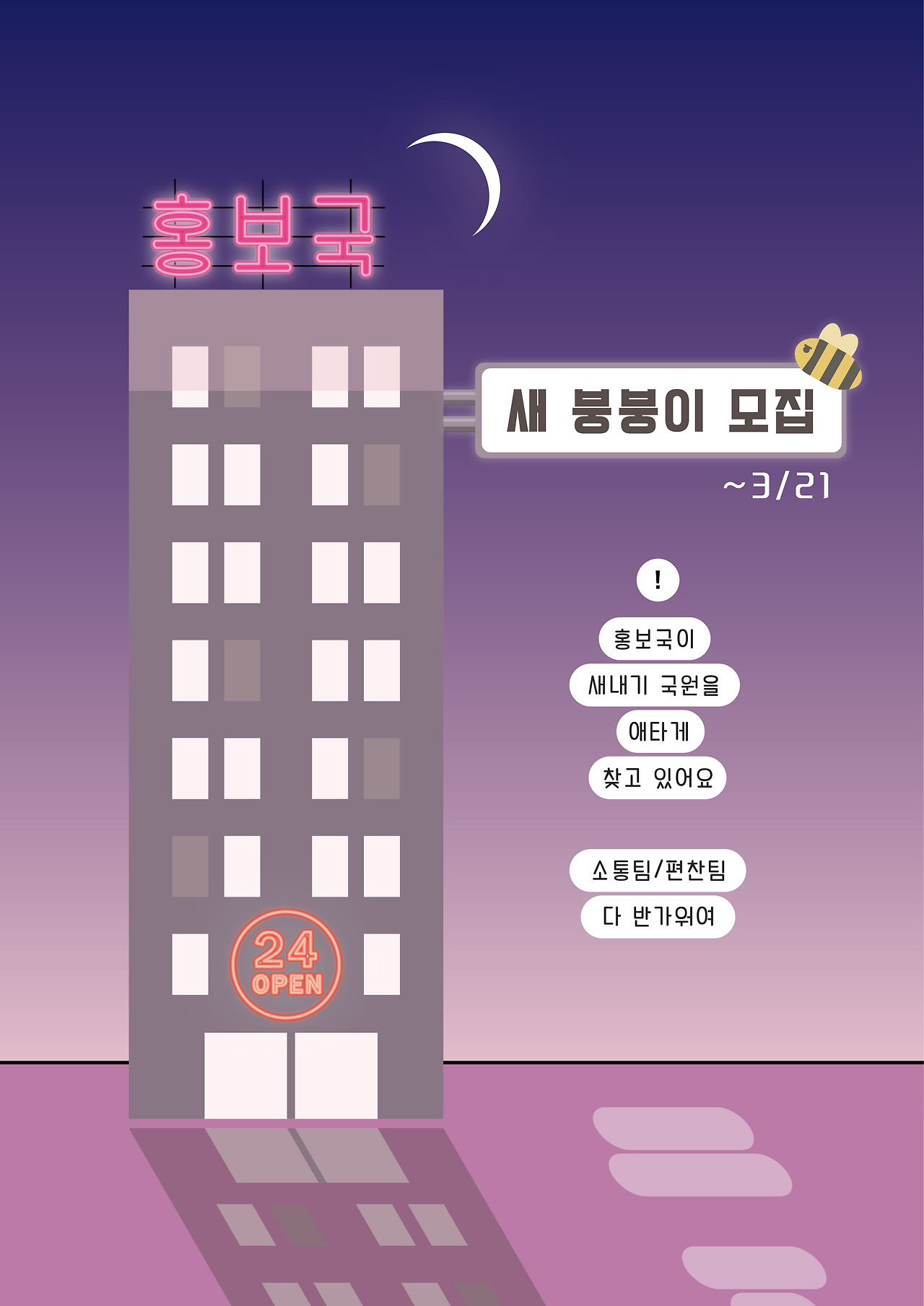 리쿠르팅 포스터에는 온종일 불 켜진 건물로 환영하는 장면을 그렸다. 신모래 작가가 한창 인기였고, 네온과 반사된 불빛을 표현하는 일러스트가 대세였다. 고 스타일 고대로 따라해봤다. 종강총회 포스터에는 위트를 담아볼까 해서 메로나를 그려보았고 (올 때 메로나), 교수님들과 졸업생들이 참석하는 무거운 행사는 또 그 나름대로 무게 있는 서체를 써보았다. 해보고 싶은 디자인을 해볼 수 있다는 건 정말 좋은 일이었다. 바빠도 불만이 없는 나날들이었다.