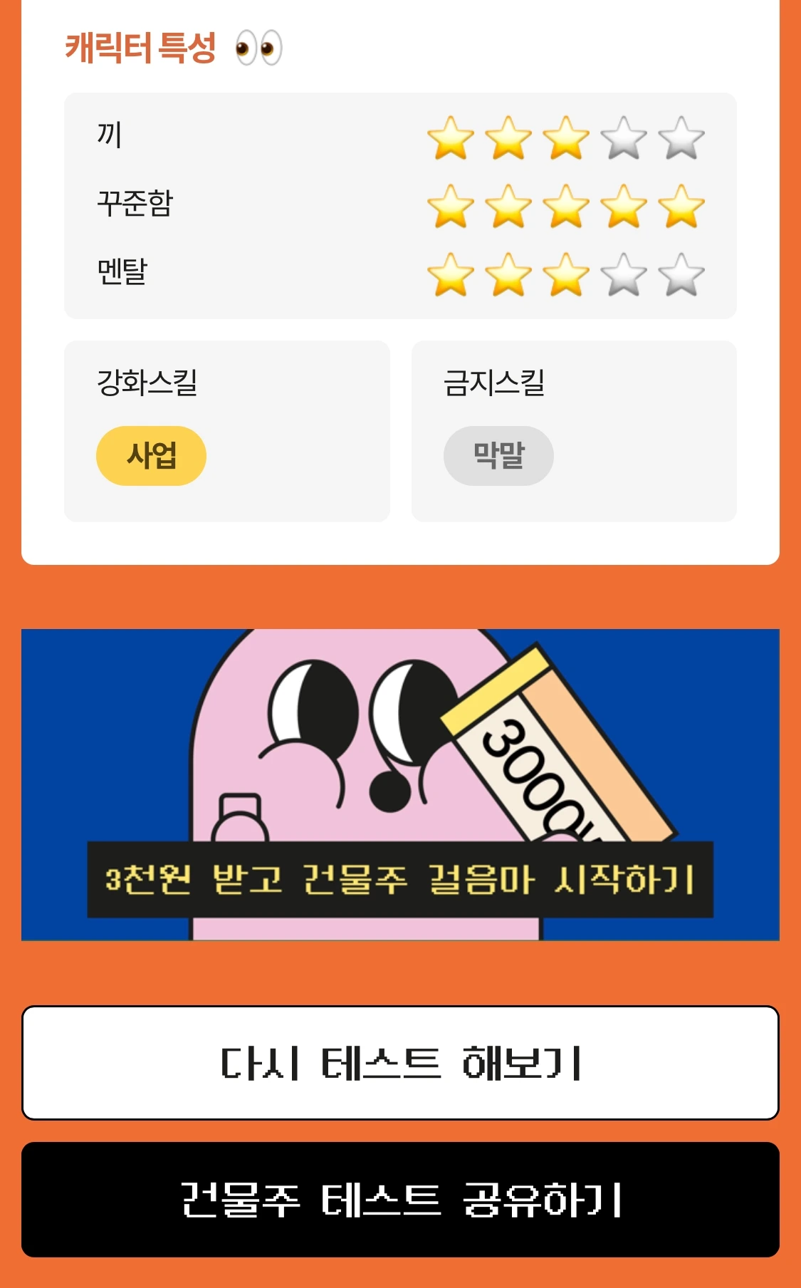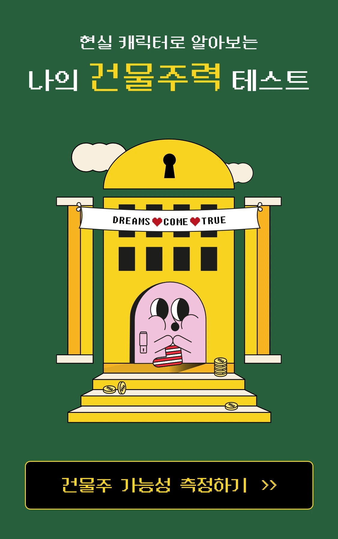 한편 어니스트펀드는 MZ가 좋아하는 심리테스트를 도입한 ‘건물주 테스트’를 선보이기도 했는데요. 요즘 유행하는 MBTI나 각종 심리 테스트 형식을 그대로 빌린 것이에요. 투자 성향, 경제관념에 대한 질문을 통해 ‘건물주력’, 즉 소유할 건물 금액을 눈으로 보여주고, 건물 획득법(?)을 팁으로 알려주어요.
