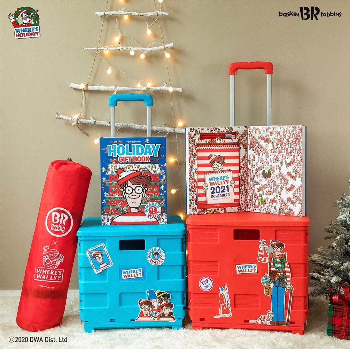 첫 번째 후보! 베스킨라빈스는 이번 크리스마스에 윌리와 콜라보를 진행했어요. '윌리를 찾아라'의 그 윌리인데요. 트레이드마크인 빨간 줄무늬가 크리스마스와 제법 잘 어울려요! 윌리를 테마로 한 3종의 크리스마스 케이크와 다이어리, 기프트북, 폴딩카트 등의 굿즈 상품이 출시되었는데요. 특히 기프트북의 경우에는 숨어 있는 여러 굿즈를 찾아보는 재미가 있다고 해요.