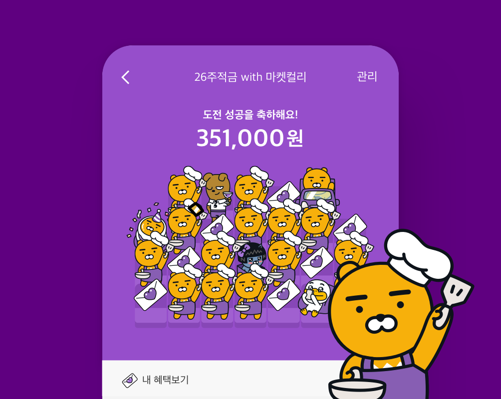한정판 캐릭터를 활용한다는 점이 다소 이해하기 어렵나요? 원래 카카오뱅크의 26주 적금은 한 주씩 납입을 성공할 때마다 26개의 자리에 캐릭터가 한 명씩 채워지게 되는데요. 모두 채워지고 나면 공유 기능을 활용해 친구에게 자랑까지 할 수 있어요. 이때 마켓컬리만의 한정판 캐릭터는 요리를 하거나, 배달을 하거나, 쇼핑을 하는 모습으로 특별 제작되었다고 하네요!
