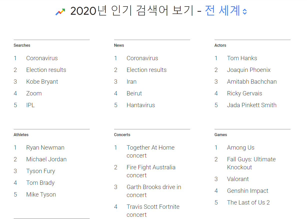구글은 전 세계의 검색어 순위를 공개했어요. 세계에서 가장 많이 검색한 키워드는 역시나 'Coronavirus(코로나 바이러스)'였어요. 미국과 한국의 최다 검색 키워드도 마찬가지구요. 다음으로는 'Election Result(미