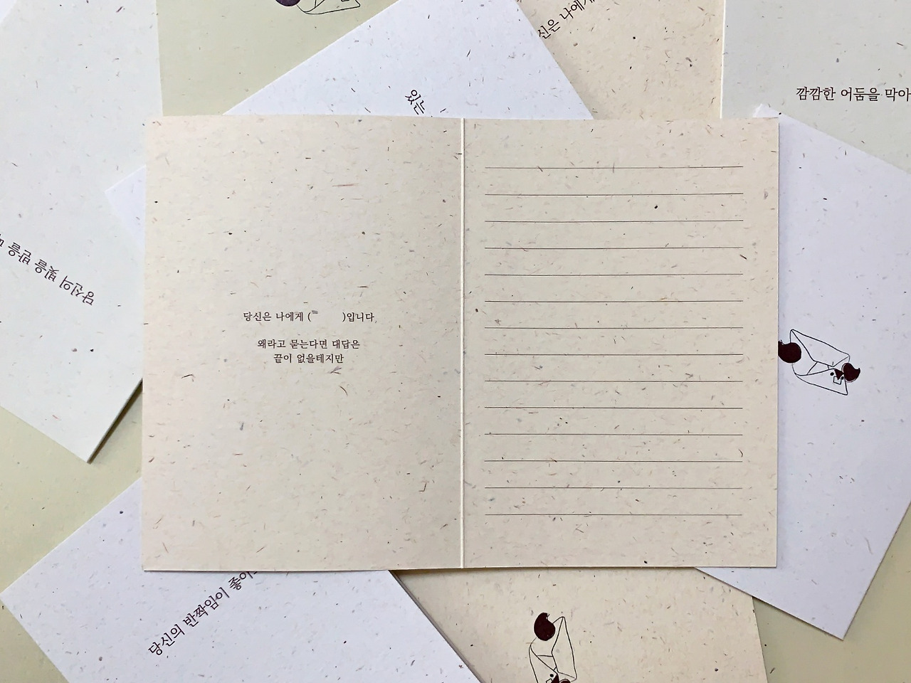 두 번째로는 실물 제품을 제 손으로 직접 만드는 일이 즐거웠어요. 디자인을 하고, 도면을 만들고, 발주를 넣고, 발로 뛰고 고생하며 실물을 받아봤을 때 느껴지는 희열이 너무 좋았어요. 그 중에서 가장 좋아한 게 지류(종이)예요. 예전에는 다이어리나 노트에 관심을 갖기도 했는데, 이미 세상에 너무 많은 제품이 나와있잖아요. 그에 반해 편지는 새롭게 확장해볼 수 있는 영역이 충분하다고 느꼈어요. 시중에 나와있는 편지지는 디자인이 서로 다르더라도 기능은 비슷한 것 같아요. 무지거나, 줄이 그어져 있는 게 전부죠. 그래서 "편지에도 특별한 기능을 넣으면 어떨까?" 생각했어요.