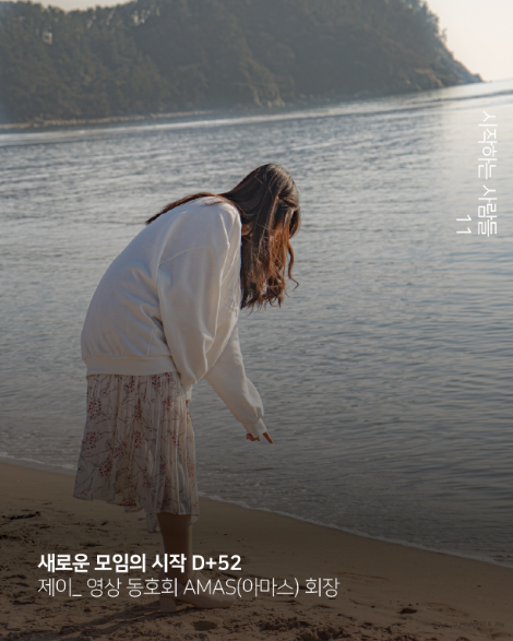 저는 AMAS(아마스)라는 영상 동호회를 시작해 이끌고 있는 제이(jay)입니다. AMAS는 부산을 중심으로 활동하는 영상 제작 커뮤니티예요. 19년도 6월에 제가 처음 만들었고 지금까지 동호회장을 맡고 있어요. 한동안 코로나로 활동이 어려웠는데요. 지난 7월에 홈페이지도 만들고 홍보도 하면서 대대적인 리뉴얼을 하고, 활동을 재개하고 있어요. 최근에 성장세가 커져서 60명 정도의 회원이 활동하고 있고요.