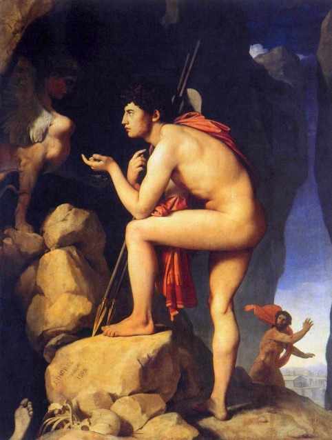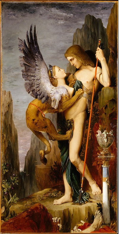 이 작품은 바로 오이디푸스가 스핑크스의 수수께끼에 도전하는 장면을 묘사하고 있다. 죽느냐 사느냐의 순간인 셈이다. 하지만 이 작품 속의 스핑크스와 오이디푸스가 주고받는 눈빛에는 살의라기보다는 교태가 서려있다. 최신 파리 스타일로 땋아 올린 머리에 예쁘장한 얼굴을 한 스핑크스는 유혹하는 듯한 눈빛으로 오이디푸스를 올려다보고 있고, 가늘고 고운 선의 중성적인 매력이 넘치는 오이디푸스는 한편으로는 그 눈빛을 받아주는 듯도 하고 한편으로는 흔들리지 않는 것처럼 응수하고 있다. 하지만 스핑크스의 유혹은 아마 속임수일 것이다. 스핑크스의 날카로운 앞발은 잔뜩 힘이 들어간 채 오이디푸스의 심장 근처를 노리고 있으며, 오이디푸스의 발치에는 먼저 도전해서 스핑크스의 유혹에 넘어가 먹이가 되어버린 희생자들의 신체 잔해들이 널려 있다.