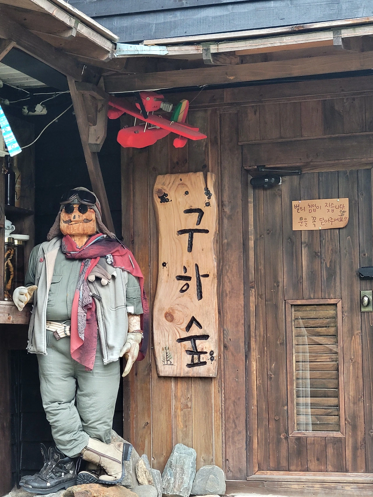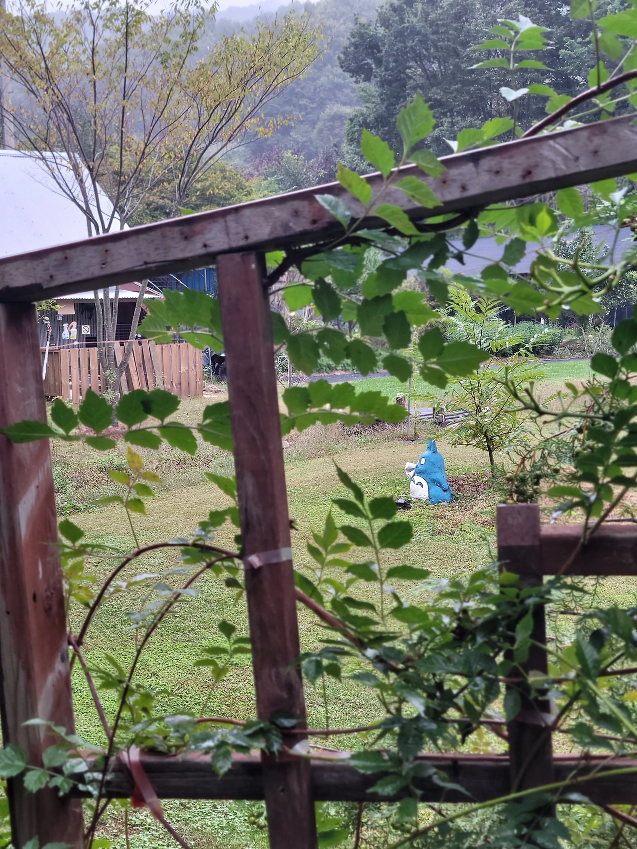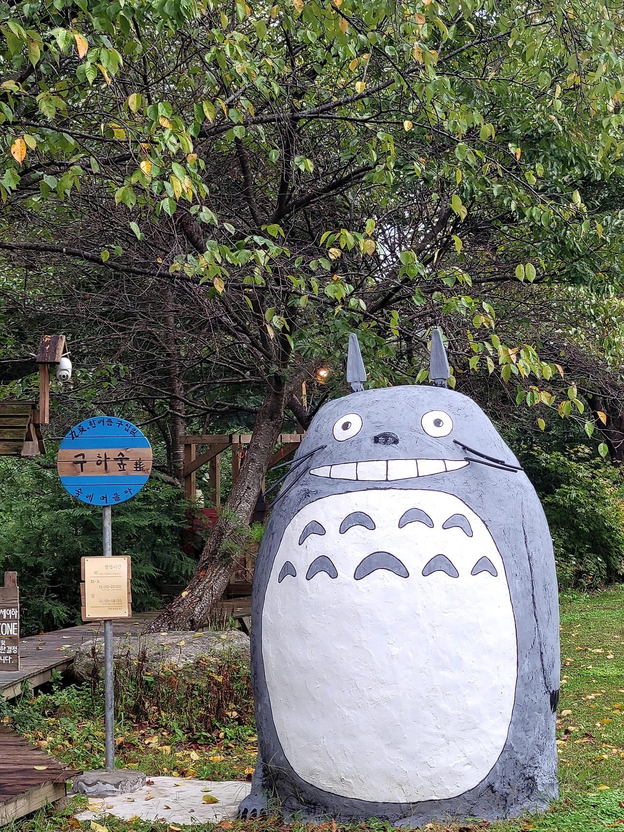 이름부터 아름다운 이곳. 구하숲이다. 구하란 '여름철의 약 90일 동안을 이르는 말'이다. 여름철의 약 90일 동안의 숲, 구하숲은 이름답게 초록의 나무로 둘러싸여 있었다. 카페주인은 지브리 스튜디오를 좋아하는지 카페 앞 넓은 잔디밭 주변에는 토토로와 가오나시, 무대가리(?)가 있었다. 지브리 캐릭터와 계곡의 물소리와 토독토독 떨어지는 빗소리를 들으며 카페로 들어가는 길이 아름다워 한참을 서성거렸다. 오래된 목조주택을 개조해 만든 구하숲 입구에는 붉은 돼지가 기다리고 있었다. 문을 열자 삐걱거리며 지브리 영화 속 환상의 공간으로 순간이동한 것만 같았다. 천장에 달린 등에는 토토로가, 천장 나무받침에는 고양이버스가 있었다. 잔잔하게 들려오는 음악에 마음이 편안해진다. 고개를 돌리니 창밖으로 초록의 나뭇잎이 흔들리고 있었다. 마루에 낮은 테이블이라 신발을 벗고 올라갔다. 비가 와서 쌀쌀해진 날씨에 따뜻한 라테를 주문했다.