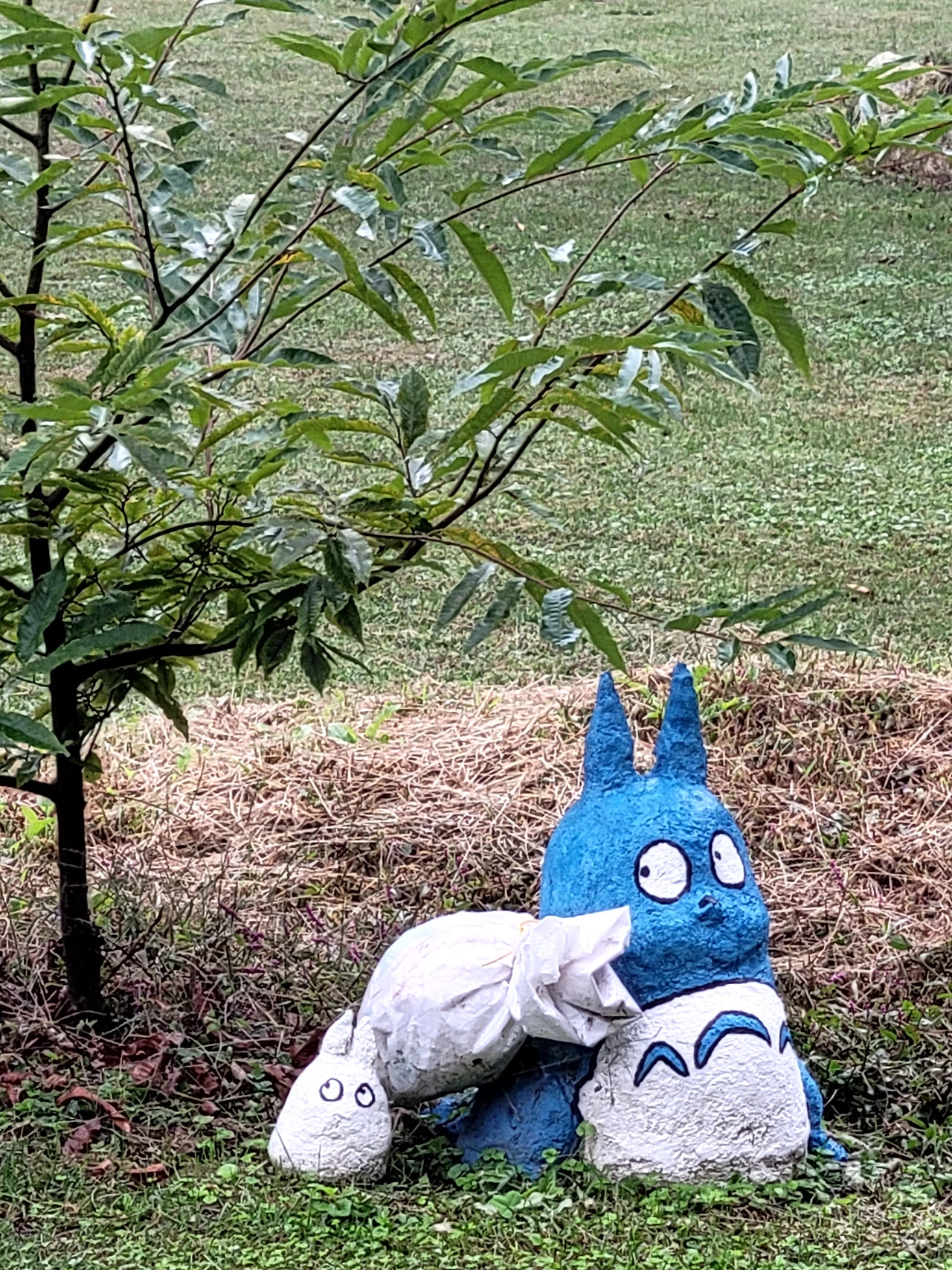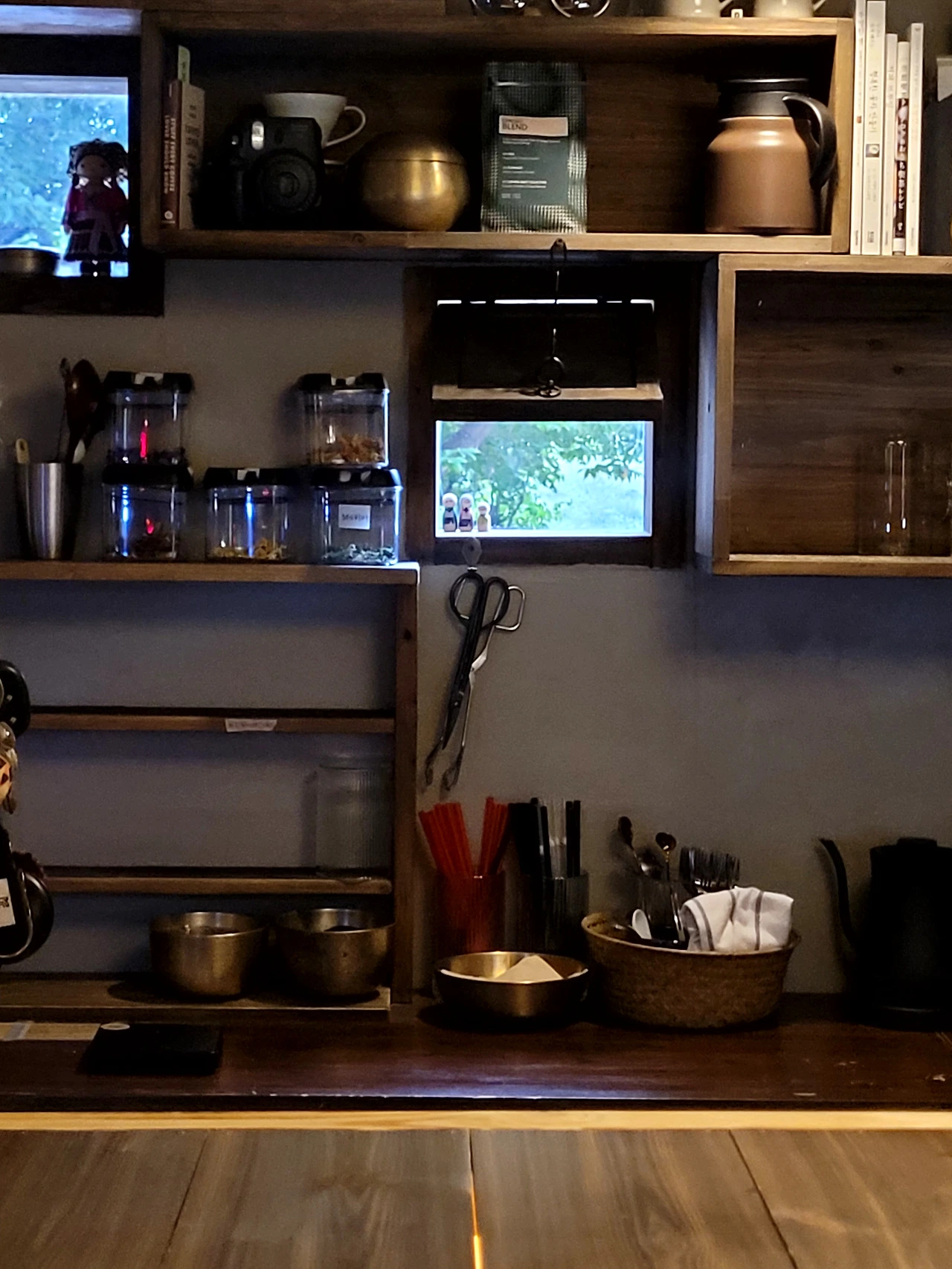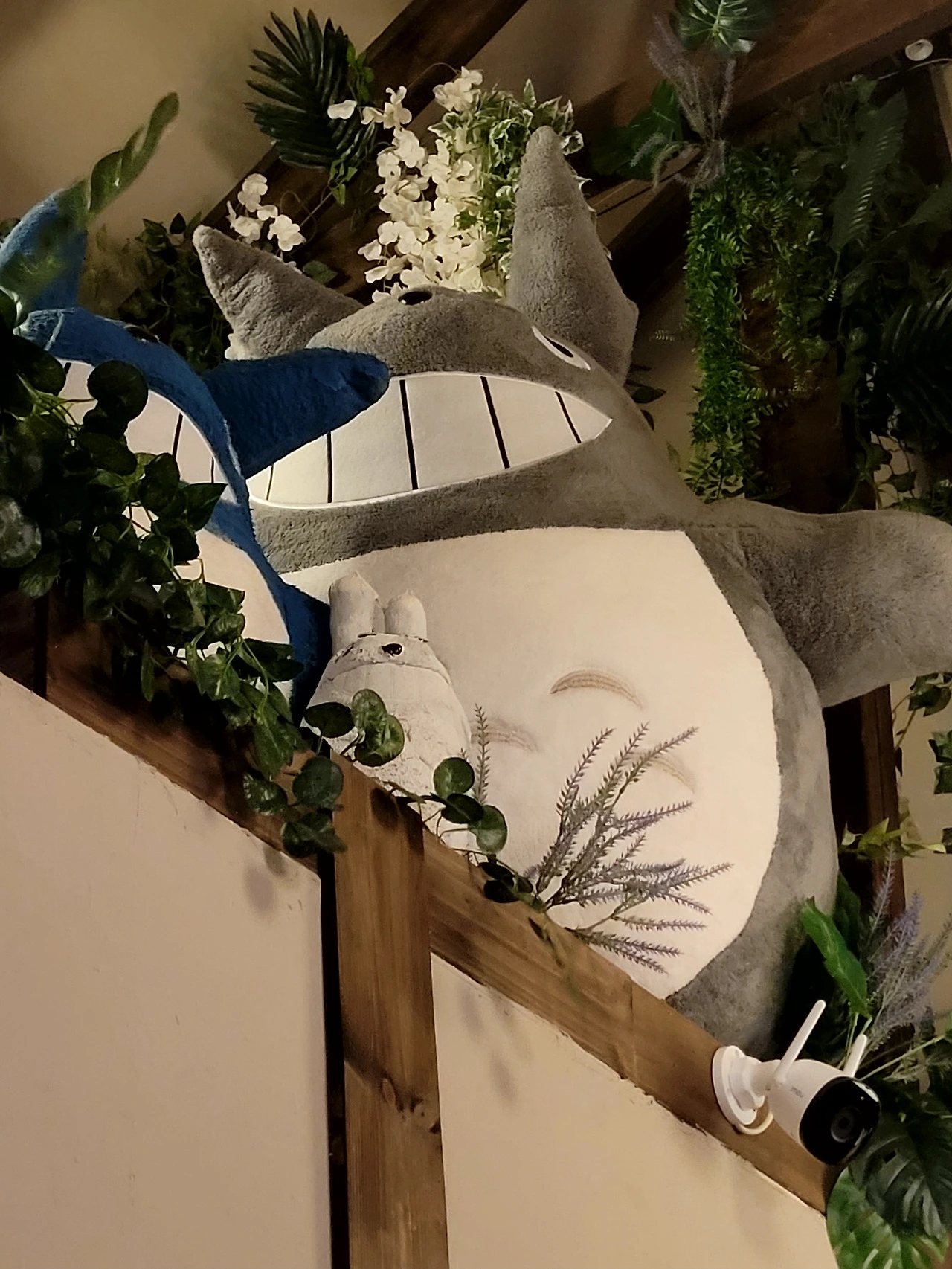 이름부터 아름다운 이곳. 구하숲이다. 구하란 '여름철의 약 90일 동안을 이르는 말'이다. 여름철의 약 90일 동안의 숲, 구하숲은 이름답게 초록의 나무로 둘러싸여 있었다. 카페주인은 지브리 스튜디오를 좋아하는지 카페 앞 넓은 잔디밭 주변에는 토토로와 가오나시, 무대가리(?)가 있었다. 지브리 캐릭터와 계곡의 물소리와 토독토독 떨어지는 빗소리를 들으며 카페로 들어가는 길이 아름다워 한참을 서성거렸다. 오래된 목조주택을 개조해 만든 구하숲 입구에는 붉은 돼지가 기다리고 있었다. 문을 열자 삐걱거리며 지브리 영화 속 환상의 공간으로 순간이동한 것만 같았다. 천장에 달린 등에는 토토로가, 천장 나무받침에는 고양이버스가 있었다. 잔잔하게 들려오는 음악에 마음이 편안해진다. 고개를 돌리니 창밖으로 초록의 나뭇잎이 흔들리고 있었다. 마루에 낮은 테이블이라 신발을 벗고 올라갔다. 비가 와서 쌀쌀해진 날씨에 따뜻한 라테를 주문했다.
