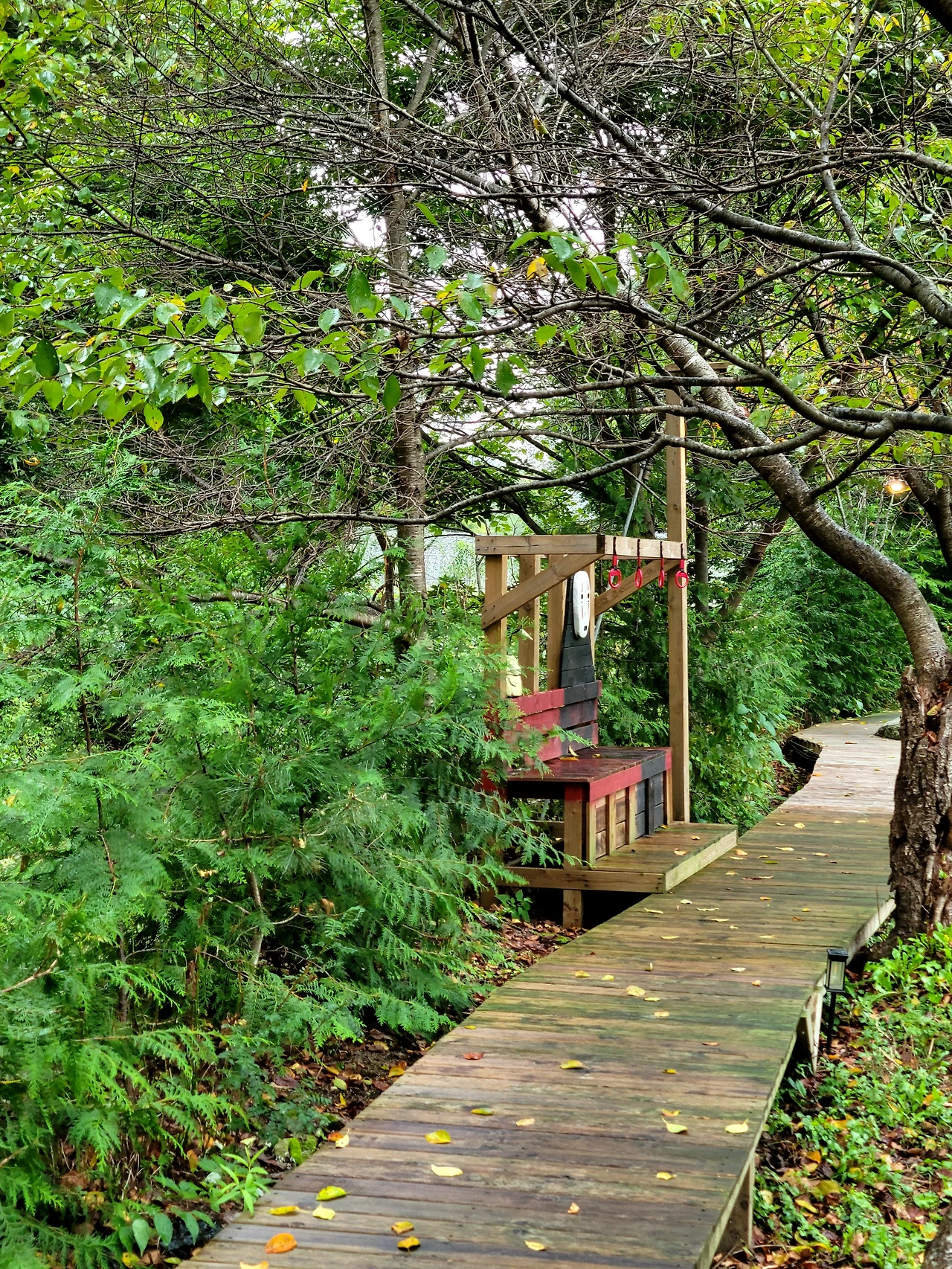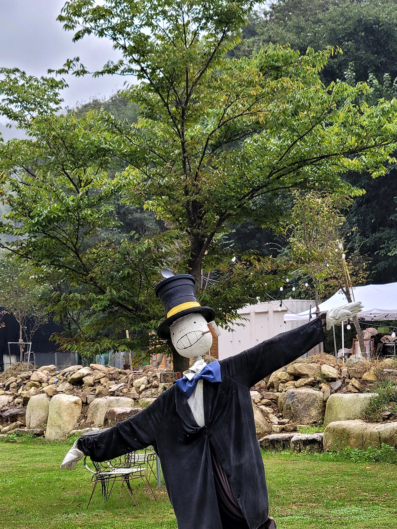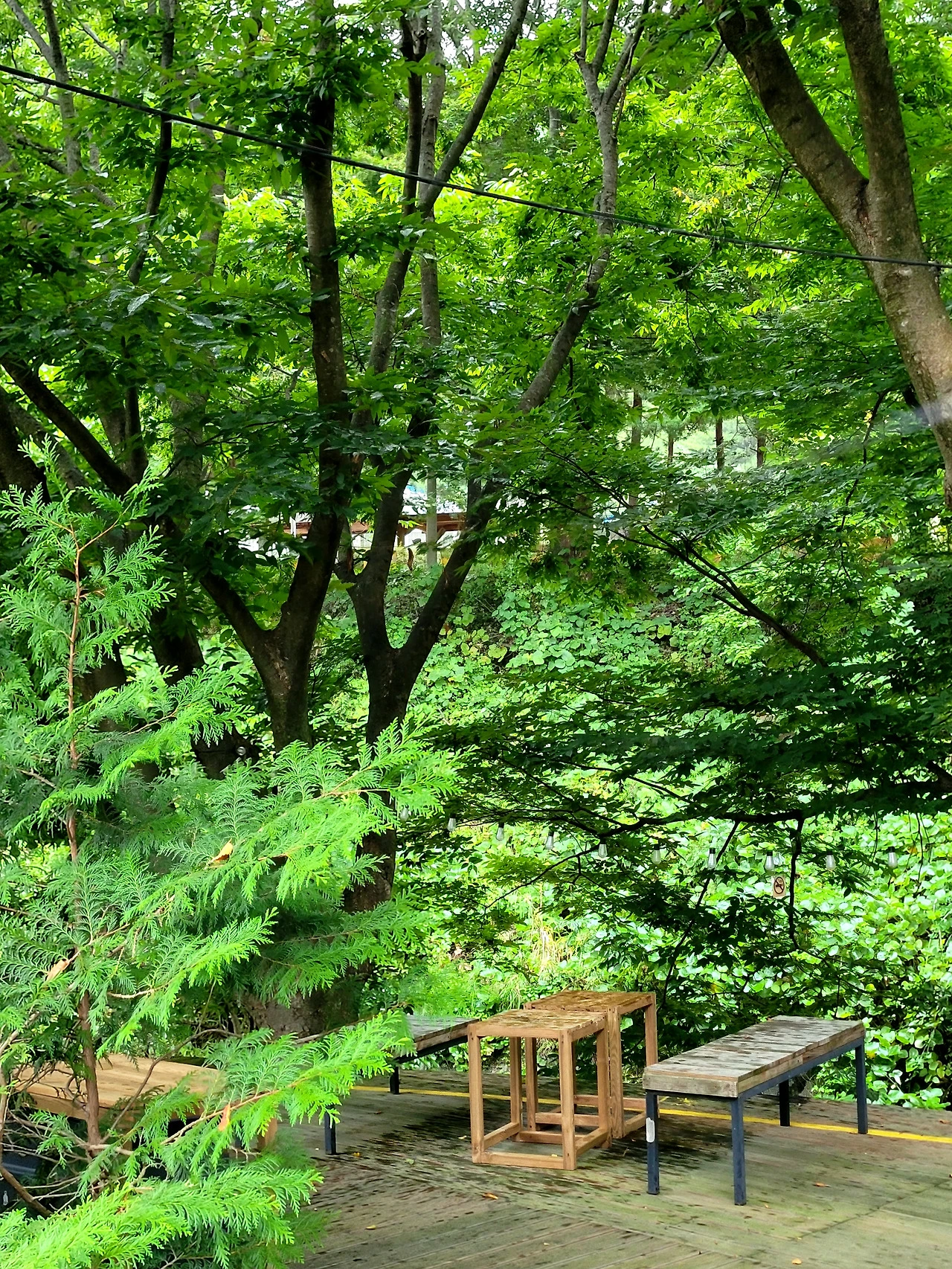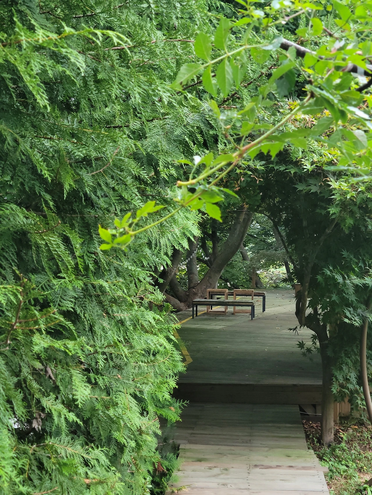 30분을 달려 카페에 도착했다. 카페로 가는 길은 벚나무가 가득했다. 봄에는 벚꽃터널로 더 아름다웠을 길은 비와 함께 초록의 이파리와 급하게 먼저 물든 이파리가 바람에 날린다. 카페에 도착하니 비밀이 숲이 나타났다.
