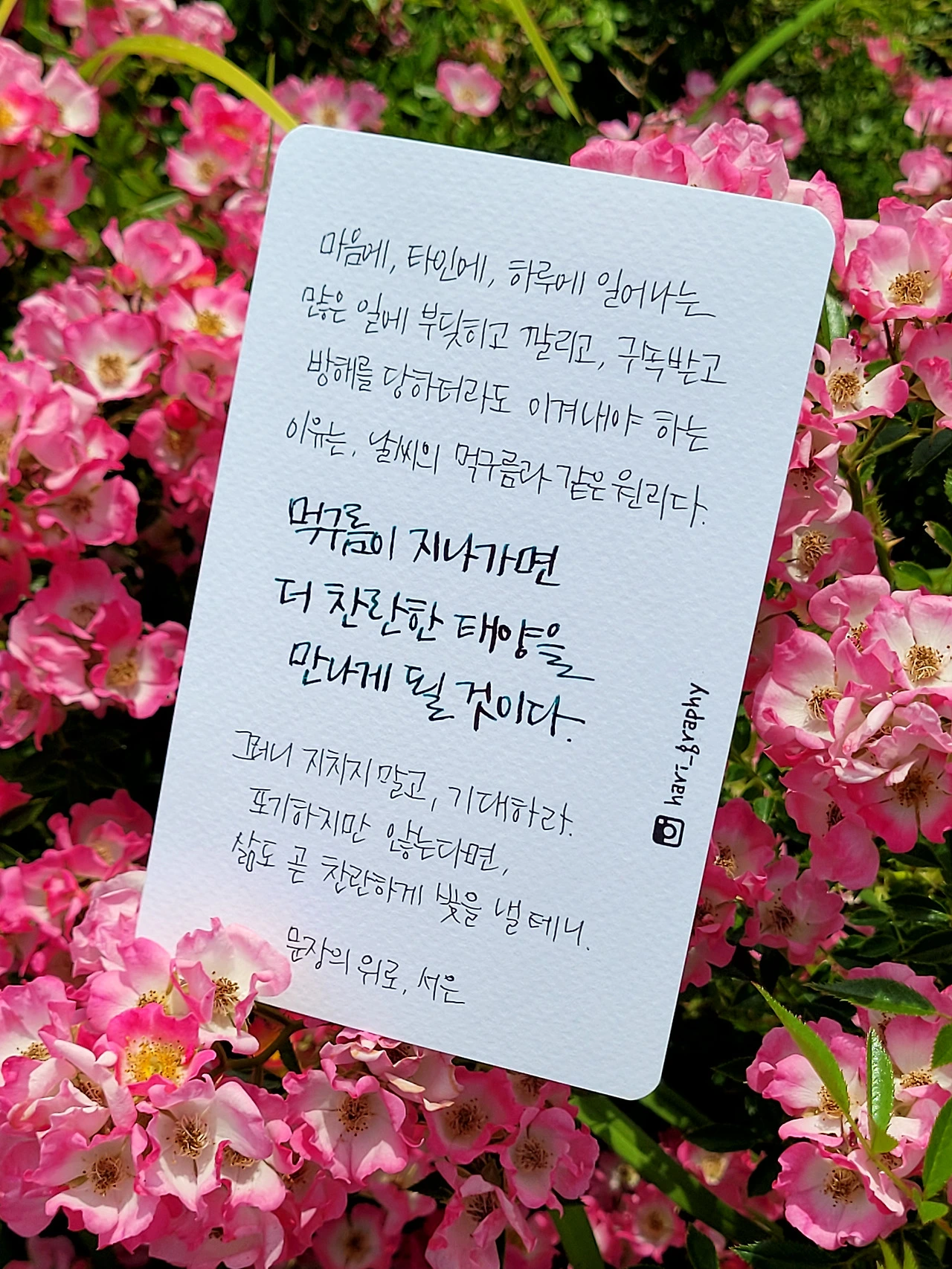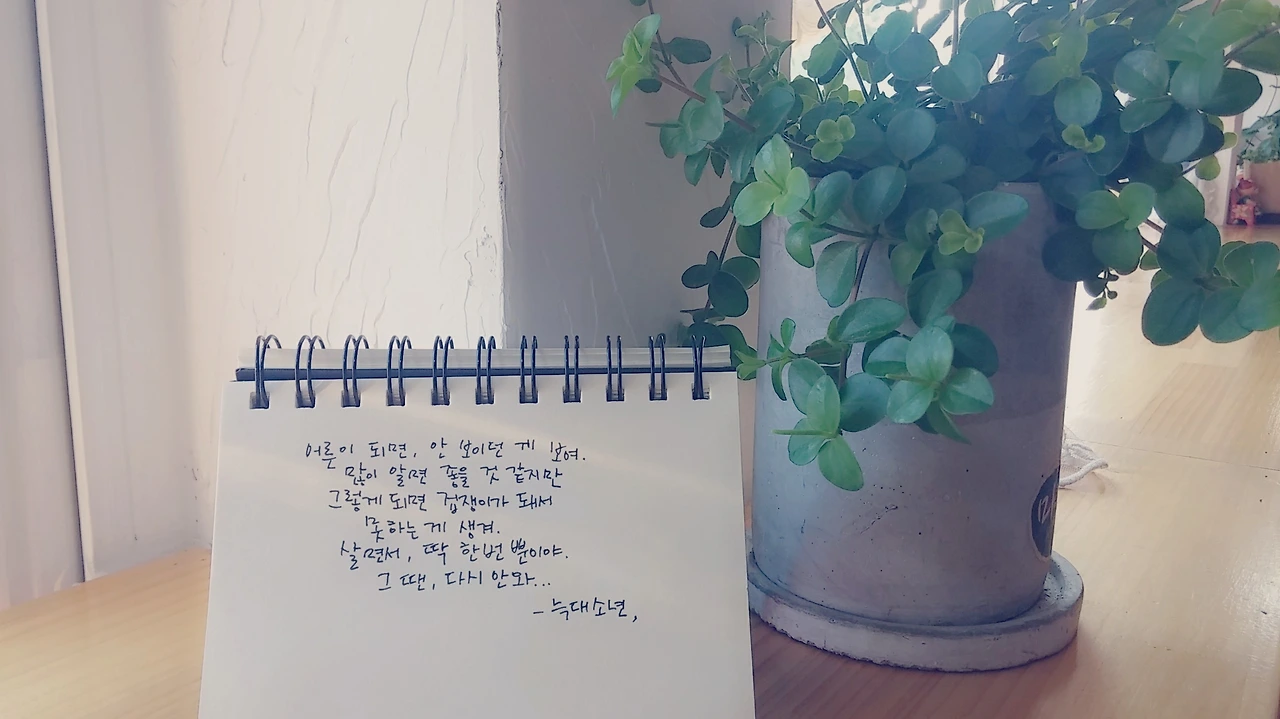 캘리그라피는 독학으로 시작했고 시작한 지 벌서 10년쯤 됐다. 하지만 잘 쓰는 건 아니다. 애매하게 잘 쓴다. 못 쓴다고 할 수도 잘 쓴다고 할 수도 없는 수준이다. 그러면 전문가에게 배우고 더 열심히 하면 되지 않느냐고 하면 할 말이 없는데 적당히 노력하면서 잘하고 싶은 욕심이자 놀부심보라고 해야겠다.