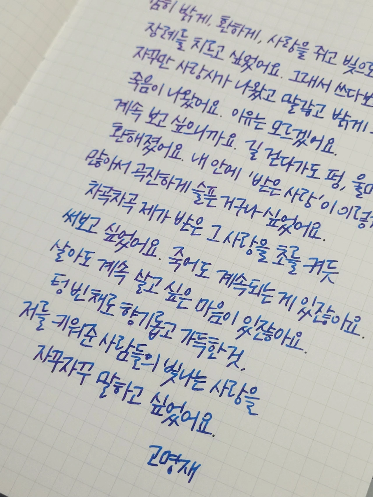 ■ 감히 밝게, 환하게, 사랑을 쥐고 빛으로 가득한 장례를 치르고 싶었어요. 그래서 쓰다 보니 자꾸만 사랑 시가 나왔고 말갛고 밝게 그린 죽음이 나왔어요. 이유는 모르겠어요. 계속 보고 싶으니까요. 길 걷다가도 펑, 울며 환해졌어요. 내 안에 ‘받은 사랑’이 이렇게나 많아서 곡진하게 슬픈 거구나 싶었어요. 차곡차곡 제가 받은 그 사랑을 초를 켜듯 써보고 싶었어요. 죽어도 계속되는 게 있잖아요. 살아도 계속 살고 싶은 마음이 있잖아요. 텅 빈 채로 향기롭고 가득한 것. 저를 키워준 사람들의 빛나는 사랑을 자꾸자꾸 말하고 싶었어요. 시인의 인터뷰 중에서