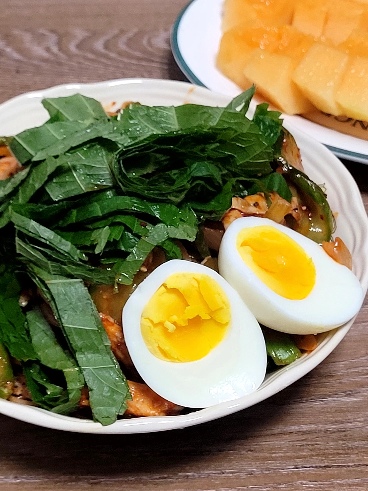 절인 오이와 양파를 꾹 짜서 플레이팅을 좀 해서 사진을 찍었다. 앗! 계란 안 올렸잖아? 이미 다 비빈 후였다. 뭐 어때 계란 올리고 다시 찍자.