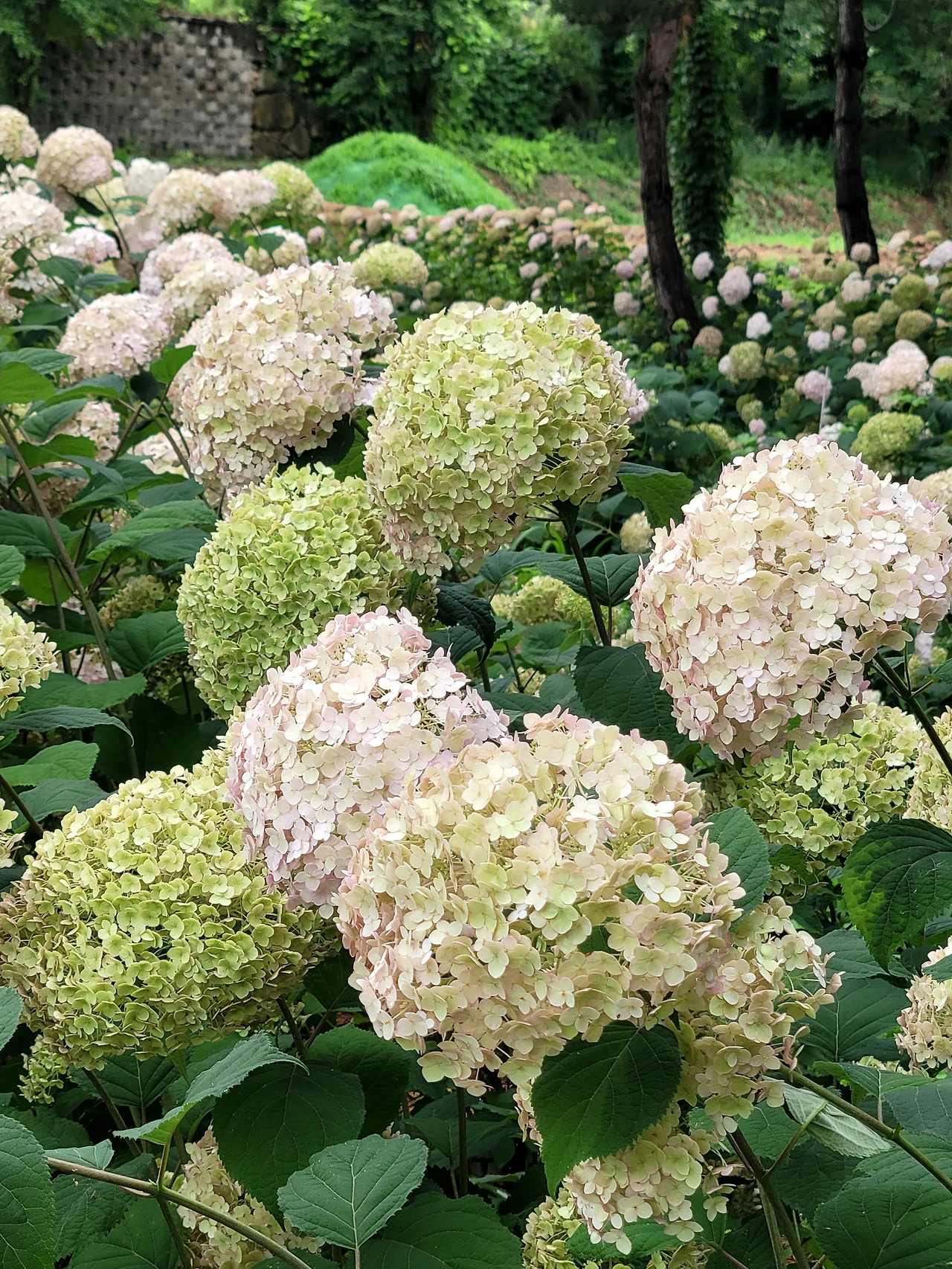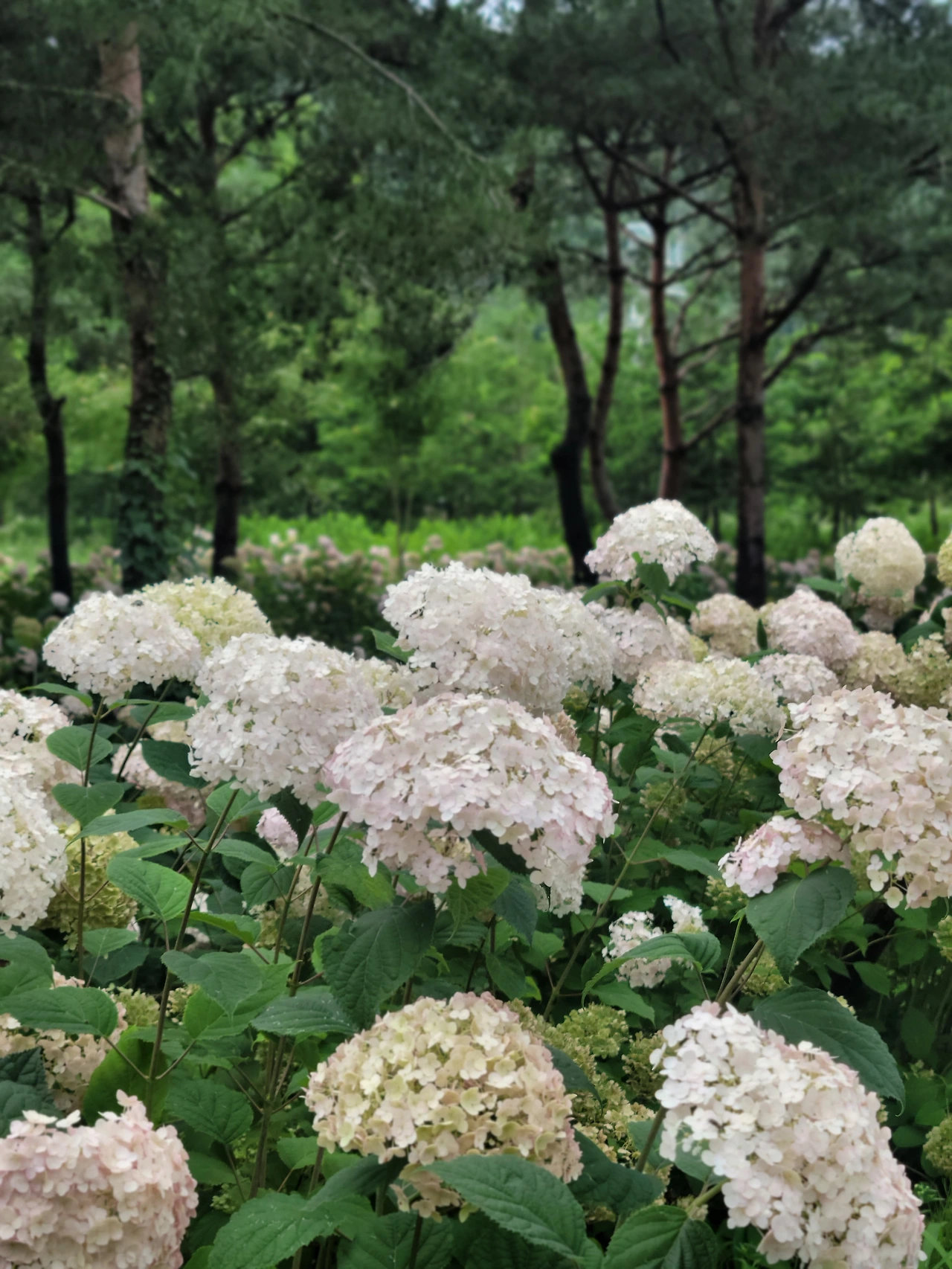 차에 짐을 넣어두고 수국밭으로 갔다. 밤새 비가 내려서 수국들이 많이 주저앉았다. 내가 생각했던 수국은 키가 작은 느낌이었는데 키가 큰 수국이 많았다. 꽃대가 얇아서 꽃송이가 고개를 숙이고 있었다. 좀 더 관리하면 좋을 텐데 아쉽다. 하지만 그래서 사람들이 없는지도 모르겠다. 아주 넓지는 않았지만 천천히 수국을 둘러보았다. 비에 젖은 수국을 보며 걷는 고요한 시간이 좋았다. 짧은 산책을 끝내고 모기 물린 다리를 벅벅 긁으며 차로 돌아갔다. 고요한 산책이었으나 모기와의 전쟁이었나 보다.