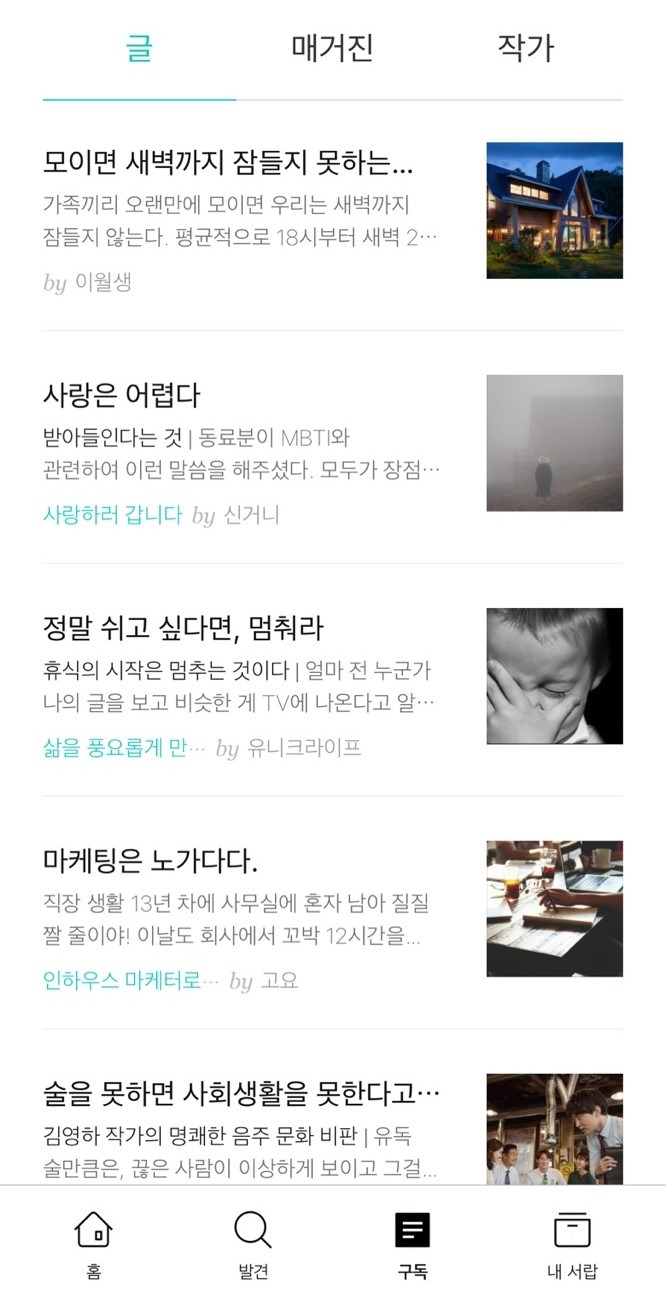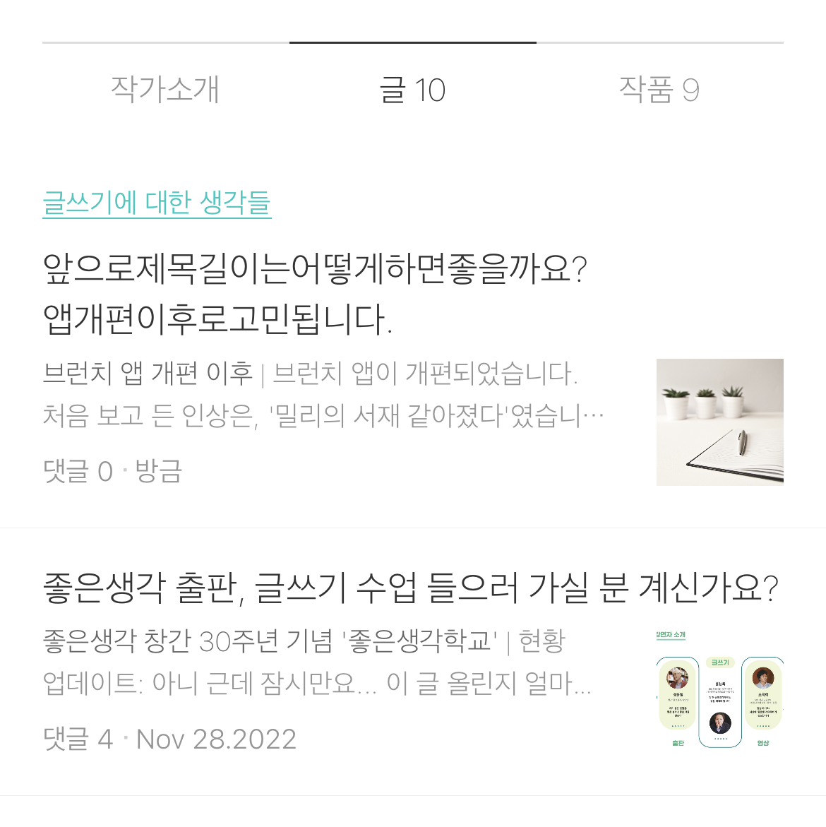 브런치 앱이 개편되었습니다. 처음 보고 든 인상은, '밀리의 서재 같아졌다'였습니다. 독자가 새로운 글을 발견하기 더 쉽게 바뀌었더라고요. 카카오가 브런치에 여전히 많은 노력을 기울이고 있다는 게 느껴져서 흐뭇했습니다. 그런데, 한 가지 고민이 생겼습니다. 발견 및 구독 탭에서 제목이 보이는 방식이 달라졌기 때문입니다. 표지 사진을 올리는 경우, 제목 길이가 이전에 비해 더 짧게 노출되었습니다.