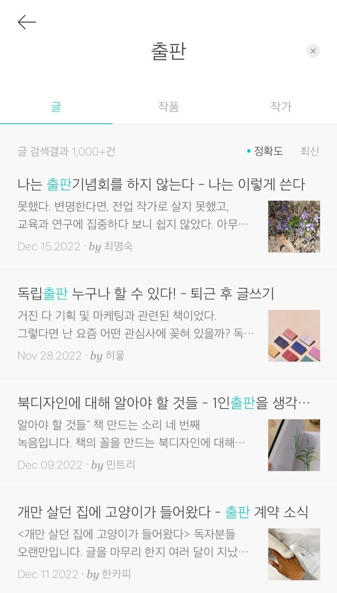 기존에는 표지 사진을 올렸을 때 공백 포함 30자까지 노출되었다면, 개편 후에는 공백 포함 16자까지 노출됩니다. 하단 왼편의 검색탭 사진에서 "북디자인에 대해 알아야 할 것들 - 1인 출판을 생각"과, 오른편의 구독탭에서 "모이면 새벽까지 잠들지 못하는"을 기준으로 계산해보았습니다. 글을 검색할 때에는 예전 방식대로 노출되지만, 개편된 탭에서는 제목 길이가 더 줄어서 노출되는 것입니다.