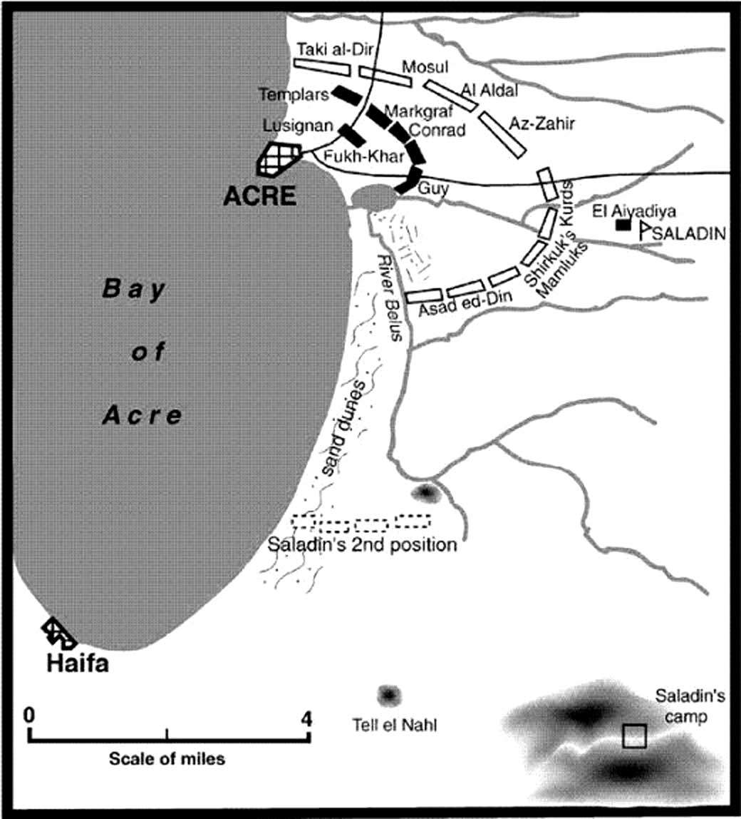 왕국 왕가의 문장아크레 공방전 당시 십자군과 살라딘의 이슬람군의 군대 배치도를 살펴보면 당시의 전황을 좀 더 이해하기 편할 것 같다. 십자군은 후방의 살라딘 본진을 방어했어야 함은 물론이었거니와 전방의 아크레성과도 공성전을 계속해야 했다. 양쪽 전선에서 동시에 이슬람군을 상대해야 했던 십자군으로서는 이슬람군보다 오히려 더 정신적, 체력적으로 지쳐있는 상황이었다. 다만 위안이 되었더 것은 아크레성 인근 연안지역 제해권은 십자군 진영 이탈리아 제네바, 피사 해군이 장악하고 있었기에 해안을 통해 키프로스, 티루스 및 타 십자군 공국으로부터 보급품이 원활하게 공급될 수 있어서 장기전을 치루고 있던 어려운 상황임에도 끈질기게 전투를 이어나가고 있었다. 또한 가까운 미래에 반드시 유럽에서 지원군이 도착한다는 일말의 희망이 있었기 때문에 끝까지 포기하지 않고 아크레성을 탈환하기 위해 공격을 하였다.