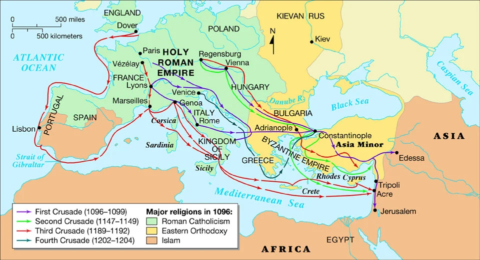 아래 빨간색 화살 표시를 통해 리처드의 영국군의 육상 및 해상 이동로를 알 수 있는데 리처드는 필립 2세와는 다르게 팔레스티나 지방으로 바로 진격을 하지 않고 이탈리아 각 도시 국가, 크레타 섬(Crete), 로도스(Rhodes) 그리고 키프로스섬(cyprus)을 거쳐서 이동을 하였고 이로인해 프랑스에서 출발한지 거의 1년여만에 팔레스티나 아크레(Acre)에 도착을 한다.