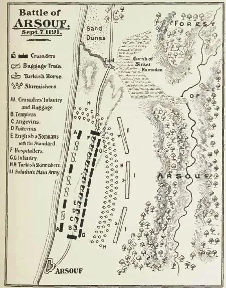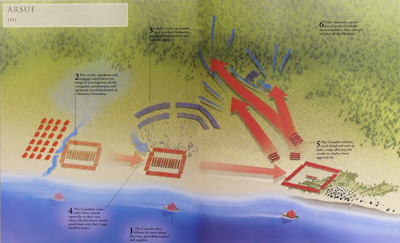 리처드가 이끄는 3차 십자군은 아크레성(Acre)을 함락한 뒤 지체 없이 아르수프(Arsuf)로 진격하였다. 아래 지도를 보면 알 수 있듯이 3차 십자군은 아크레성 탈환 후 곧바로 예루살렘으로 진격할 수 있었음에도 불구하고 먼저 해안을 따라 해안 도시를 차례로 함락하는데 예루살렘을 공격하여 예루살렘성을 탈환해도 후방 보급로가 확보되지 않으면 살라딘이 대규모 병력을 끌어모아 다시 예루살렘성을 공격할 것임을 너무나도 잘 알고 있었기에 시간이 다소 지체되더라도 해안 도시를 먼저 점령하여 바다 및 육지를 통한 보급로를 먼저 확보한 후 예루살렘으로 진격할 계획이었다.