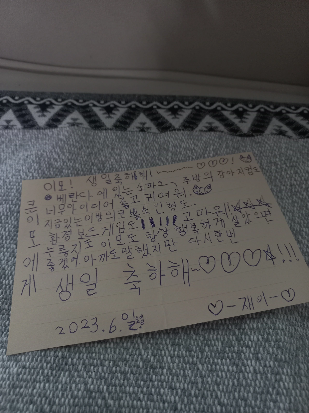 모든 기념일에 가장 핵심적인 선물은 손편지이건만 아무도 써오지 않았다. 어른들에게 억지로 시키긴 좀 그렇고, 교육적인 활동 삼아 조카에게 편지지를 꺼내주며 쓰게 했다. 내용이 일품. 집들이에 걸맞게 집에 대한 나름의 인상을 적고 생일 축하 문구도 서두와 말미에 잘 썼다. 맞춤법 틀린 곳이 하나도 없다.