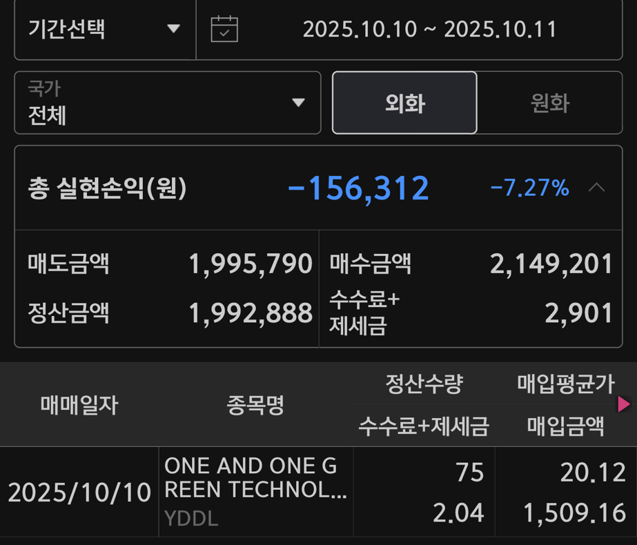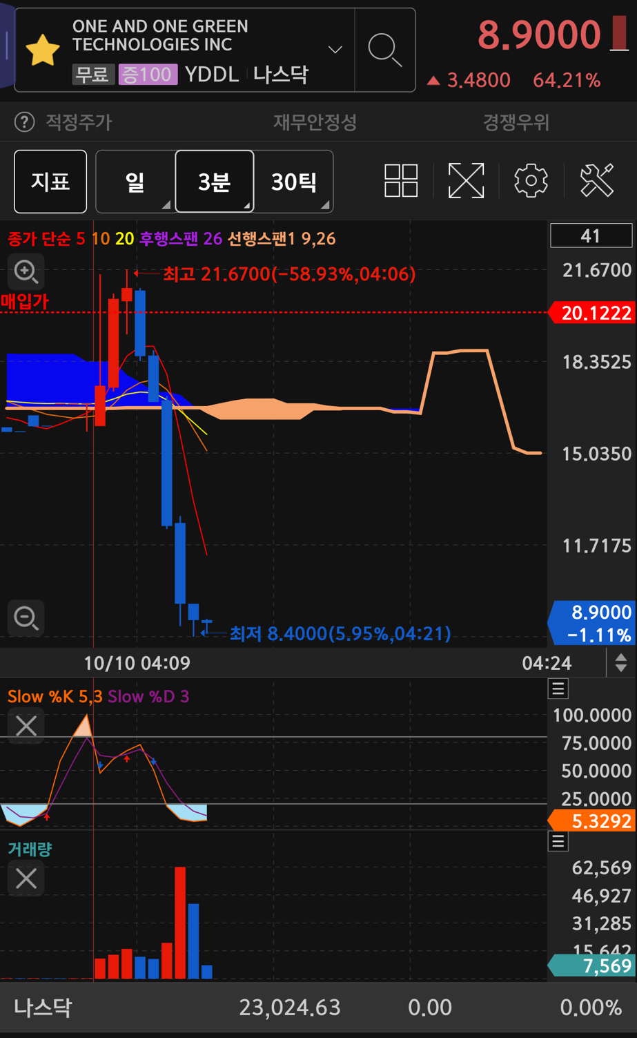 YYDL을 종배 했다. 종배 하기 전 상승으로 약 10만 원을 벌어놨다. 그래서 프리장 때 본전 직전 절반, -10% 타이밍에 절반을 팔아서 -15만 원의 손실을 봤다. 평소 같으면 하따를 통해 메꾸려고 했겠지만 기분이 좋지 않아 매매를 그만뒀다. 그러자 나온 갭하락.