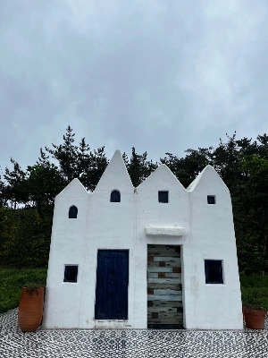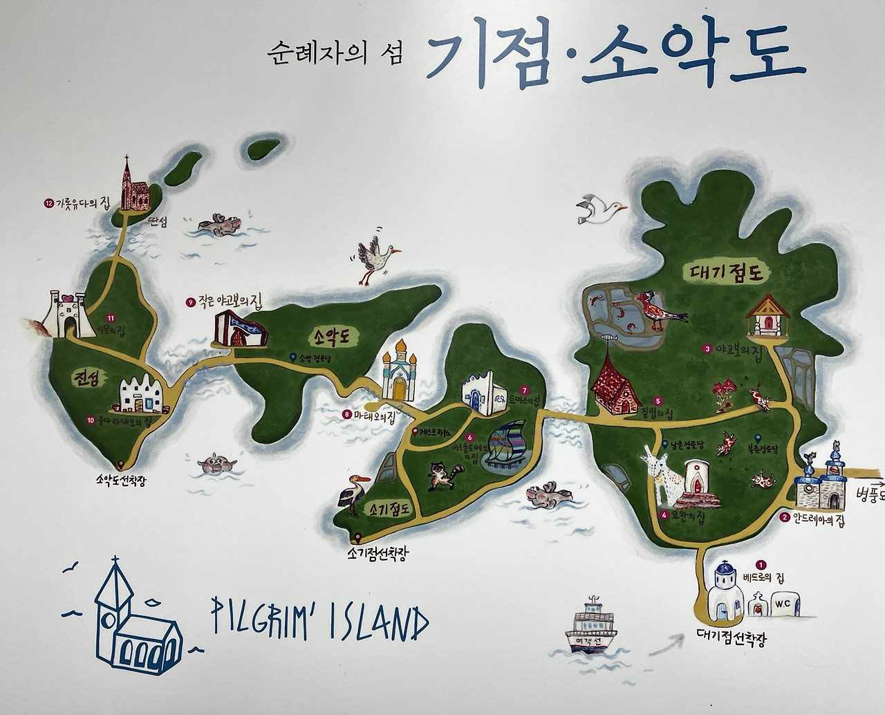 드디어 순례길 대기점도에 도착했다. 대기점도에서 소기점도, 소악도, 신추도를 걸으며 12 사도를 상징하는 집을 만나는 여정이다. 이곳의 주민들이 거의 기독교인들이고 여성 순교자 문준경이 살았던 곳이어서 순례길이라는 콘텐츠를 만들었다고 한다. 네이버로 검색했을 때 순례길을 3시간이면 걸을 수 있다고 했지만 5시간은 걸릴 듯싶고, 3시 고조, 밀물 전에 병풍도에 도착해서 배를 타야 하므로 전기자전거를 대여했다. 처음 만난 집은 베드로의 집이다. 건강을 상징한다. 송공항 선착장에서 배를 타면 이곳에도 도착한다. 바로 앞에 자전거 대여소가 있다. 다음 안드레아의 집은 생각하는 집이고 인상적인 고양이 동상이 있다. 이 섬은 주민보다 고양이가 더 많다고 한다. 우리가 자전거 경적을 울리자 고양이가 우리를 째려보았다. 우리 집 강아지만큼 이곳 고양이도 상전인 듯싶다. 야고보의 집은 그리움이고 벽에 에밀레종의 비천도가 그려져 있어 인상적이다. 요한은 생명 평화의 집이고 염소 동상이 있다. 병풍도에서 만난 염소가 떠올랐다. 염소도 섬사람들도 모두 느긋하다. 당연하다. 사람이 안달복달해도 자연의 시간은 정해져 있다. 밀물 썰물 시간대로 살 수밖에 없다. 여유에서 얻는 지혜는 뭔가 더 큰 것 같다. 필립은 행복의 집이다. 프랑스 남부 건축 양식에서 영감을 얻었다. 바르톨로메오는 감사의 집이다. 쉼표 모양이고 배처럼 물에 떠 있다. 토마스는 인연의 집이다. 마테오는 기쁨의 집이고 러시아 정교회를 연상케 한다. 아고보는 소원의 집이고 유럽 어부들의 기도소에서 아이디어를 착상했다. 유다 다대오는 칭찬의 집이다. 시몬은 사랑의 집이다. 문이 없는 유일한 건축물이다. 사랑의 집인 만큼 사람들이 둘씩 사진을 많이 찍는다. 가롯 유다는 지혜의 집이고 프랑스 몽쉘미셀처럼 동떨어진 곳에 위치해 있고 마지막 종을 울릴 수 있다. 이곳도 썰물 때가 아니면 갈 수 없다. 건축물 안에는 간단히 기도를 드릴 수 있는 공간이 있고 작은 창으로 밖을 바라보며 생각에 잠기게 한다.