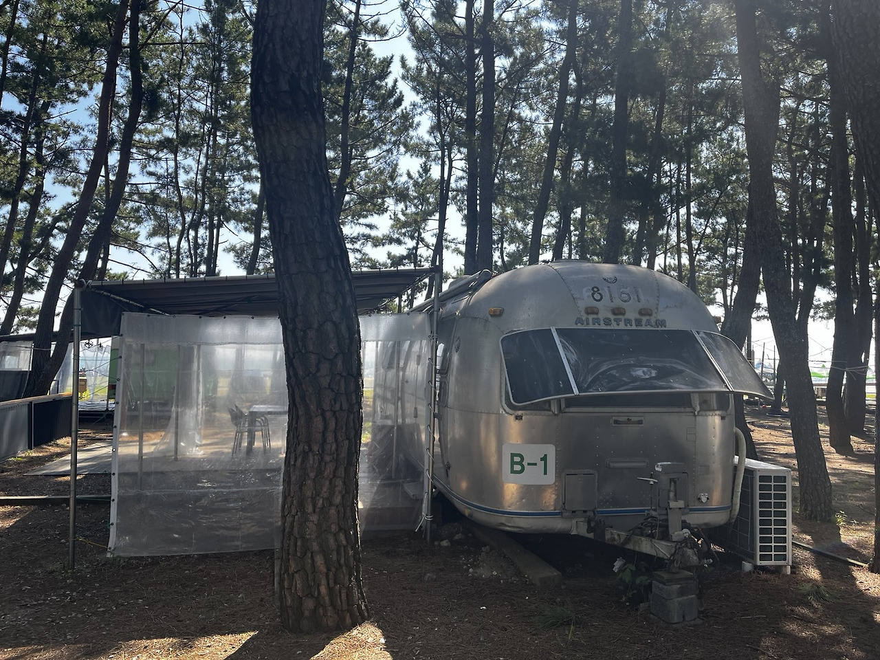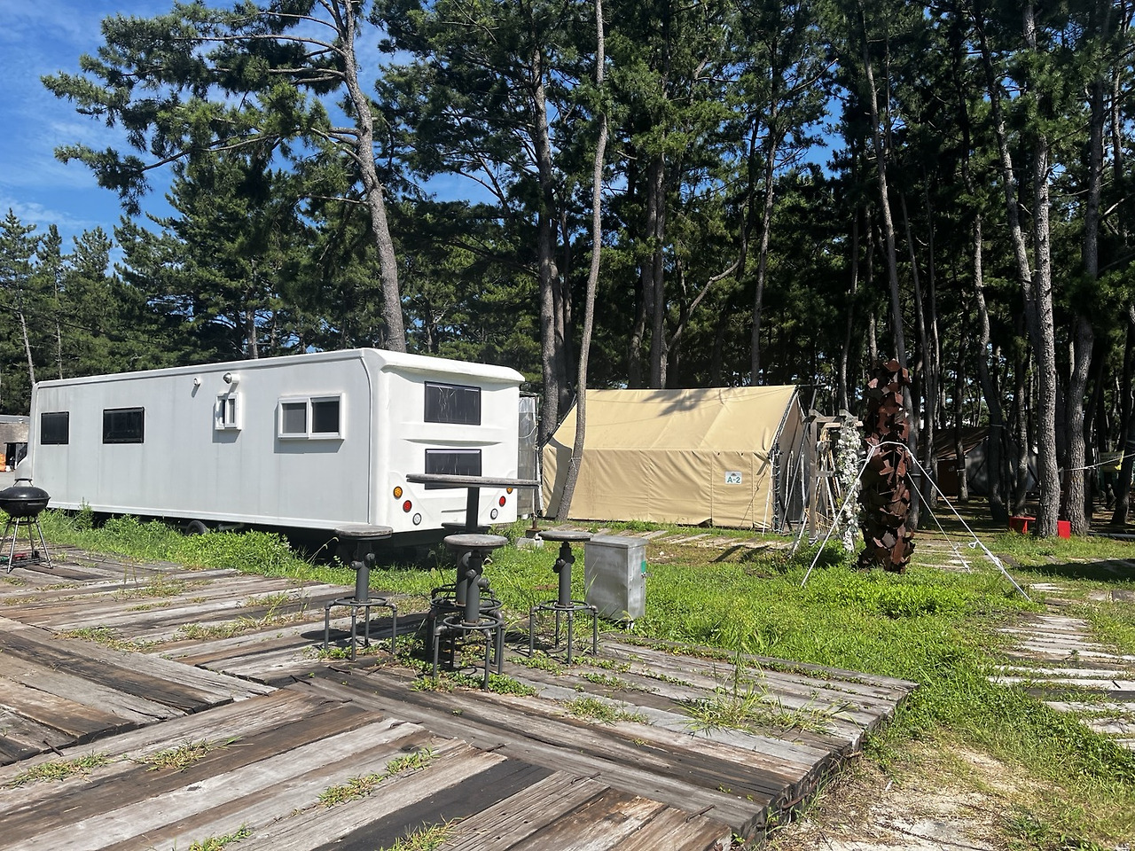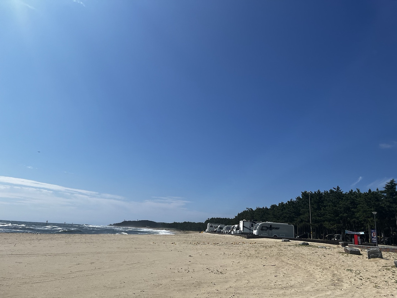입구부터 핑클 촬영장이라는 문구가 보인다. 우와~감탄사가 절로 나온다. 우선은 바다의 색깔이 너무 예쁘다. 넓고 넓은 푸른 바다와 하얀색의 카라반이 그림 같은 장면을 연출한다. 뜨거운 태양은 반사광이다. 인생컷을 찍기에 충분하다. 그러나 일기예보의 동해안 태풍주의보라고 했듯이 바람이 장난 아니게 분다. 그래도 합법적으로 카라반을 댈 수 있는 곳의 발견은 기쁨이다. 캠핑카 주차 금지라고 쓰여있는 해수욕장이 많다. 그런 곳은 모래사장에 텐트만 칠 수 있는 지형이기 때문이다. 이곳은 모래사장 바로 위에 카라반을 댈 수 있는 주차 구역을 만들어 놓았다. 많은 사람들이 이 조건 때문에 온다. 바로 앞에 해수욕을 자유롭게 즐길 수 있고 편리하게 이용할 수 있는 편의 시설이 잘 되어있다. 휴가철의 막바지라 차가 많지는 않았다. 띄엄띄엄 차를 대고 있다. 우리도 가장자리에 주차를 하고 전깃줄을 연결하였다. 와~ 정말 이곳은 캠핑카 성지와 같은 곳이다. 우리는 바람을 맞으며 다른 이색적인 카라반도 구경하고 도로 옆에 텐트를 치는 장소, 매점, 샤워시설도 구경했다. 아예 카라반을 집처럼 장착하고 숙소처럼 이용하게 하는 장소도 있다.