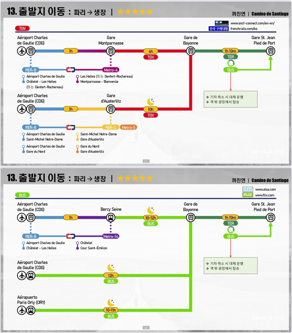 셋째, 드골 공항에서 RER을 타고 오스테를리츠에서 내려 (1시간 걸림) SNCF 야간 기차를 타고 바욘으로 가서 (10시간 걸림) 다음 날 아침 TER를 타고 생장으로 간다.(1시간 10분 걸림) SNCF 기차 예약을 미리 해야 한다.
