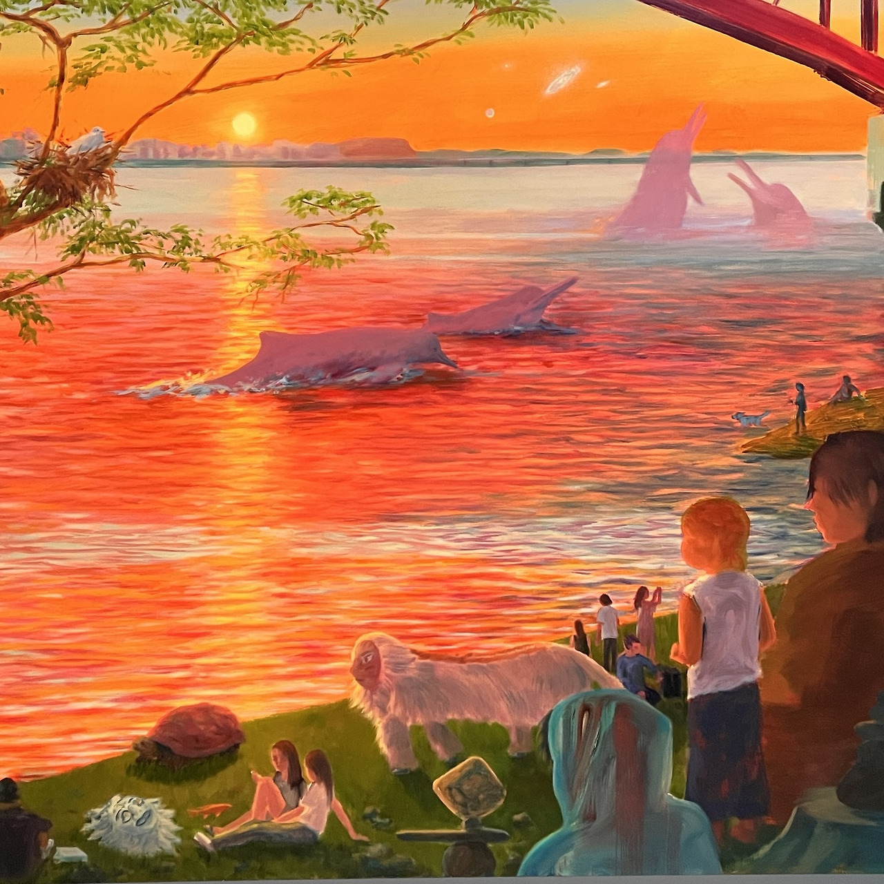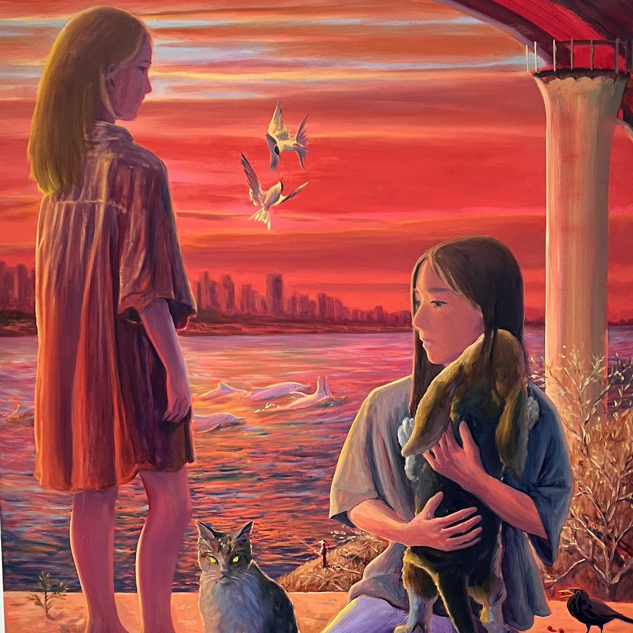 많이 외국에 나가지는 않았지만 특히 유럽은 비용이 많이 들어 늘 더 많이 보려고 분 단위로 계획을 짜면서 애를 쓴 것 같다. 그런데 음식을 먹으면서 좀 실망을 했다. 외국에서 나는 늘 한국 음식의 위대함을 더 느꼈다. 외국 음식은 단순하다. 빵과 샐러드, 커피와 주스, 과일, 파스타, 생선 구이, 스테이크 등 조리 방법이 비교적 간단하다. 한국의 장, 김치, 나물, 젓갈에 비하면 그냥 굽는 정도이다. 그래서인지 여행을 갔다 오면 한국에 애정이 생긴다. 박물관과 미술관도 마찬가지이다. 비행기까지 타고 가서 보는 아주 비싼 미술관이다. 그래서 우리나라에 오는 외국 전시는 보려고 노력한다. 강서구 스페이스 K에서 영국 런던을 기반으로 활동 중인 최민영의 전시가 열리고 있다. 오랜만에 시간을 낸 딸과 미술관 데이트를 했다. 가브리엘 가르시아 마르케스의 소설 "꿈을 빌려드립니다"에서 영감을 얻었다고 한다. 읽어보고 싶은 책이다. 작가는 유년 시절과 이주의 경험의 기억을 현실과 비현실 사이의 몽환적인 장면으로 연출을 했다. 우리나라 한강에 아마존의 돌고래가 헤엄치고 있다. 비현실적인 분위기는 밝은 색채 덕분에 애니메이션의 느낌을 주기도 하지만 전하는 메시지는 다양한 감정을 느끼게 한다. 빛과 구도 때문인 것 같다. 기형도의 "빈 집" 시가 떠오르게 하는 그림도 있고 김초엽의 "지구 끝 온실" 소설이 떠오르게 하는 그림도 있다. 한국적인 요소가 있는 그림을 보면 작가의 정체성과 향수가 느껴지기도 하면서 자연스레 공감대가 형성이 되면서 나의 유년 시절도 회상하게 만든다.