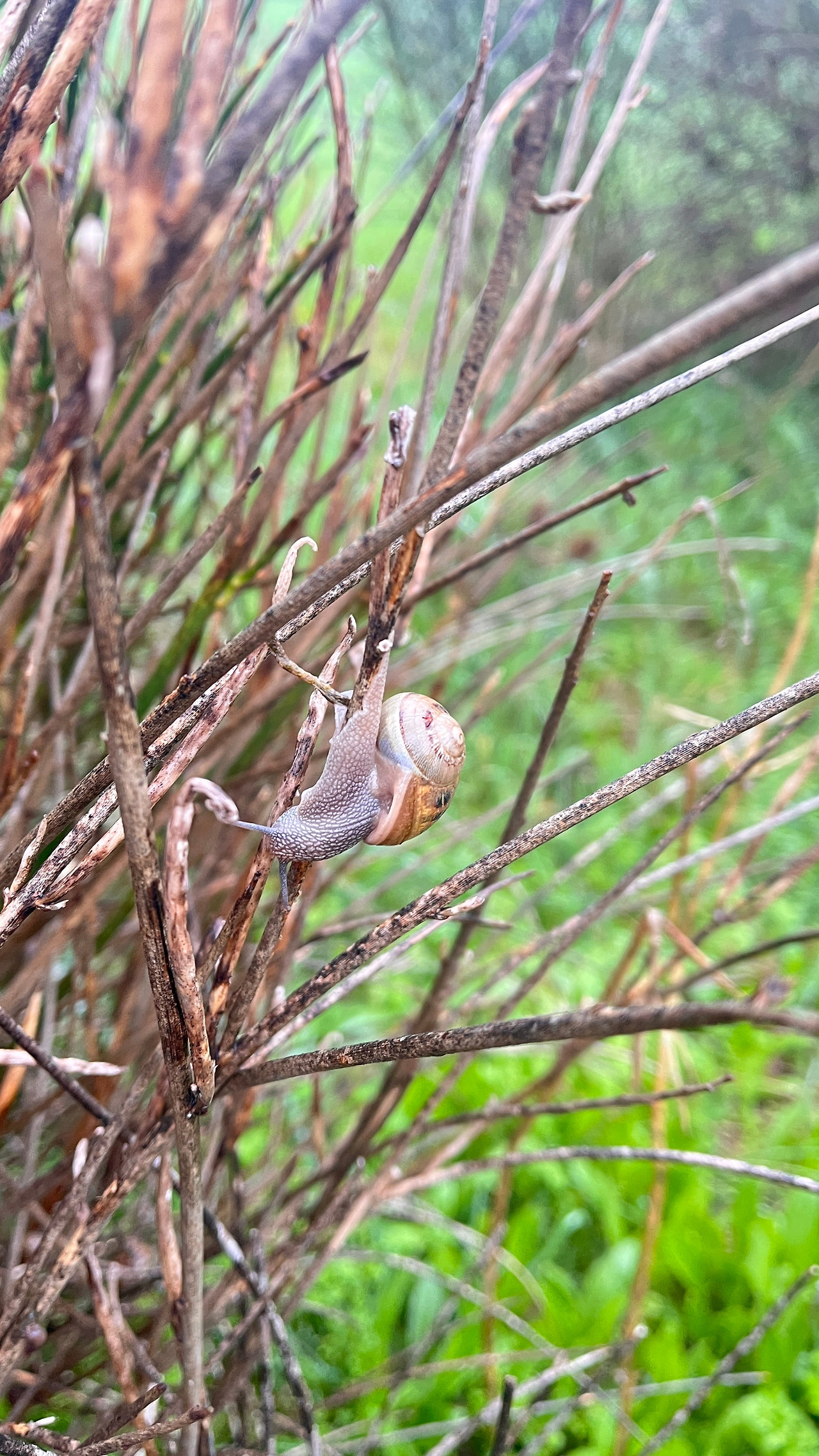 오늘은 작은 꽃과 나무들을 가까이 찍어본다. 나태주의 “풀꽃”시가 떠오른다. 어라, 나무에도 달팽이가 매달려있다. 아까 본 아이들보다는 조금 작은 것 같다. 작은 초목에 엄청 많은 달팽이가 숨어있는데 이번에는 몸색이 나무색과 가깝다. 아, 얘들에게는 이게 보호색인가 보다. 정말 자세히 보아야 보이네