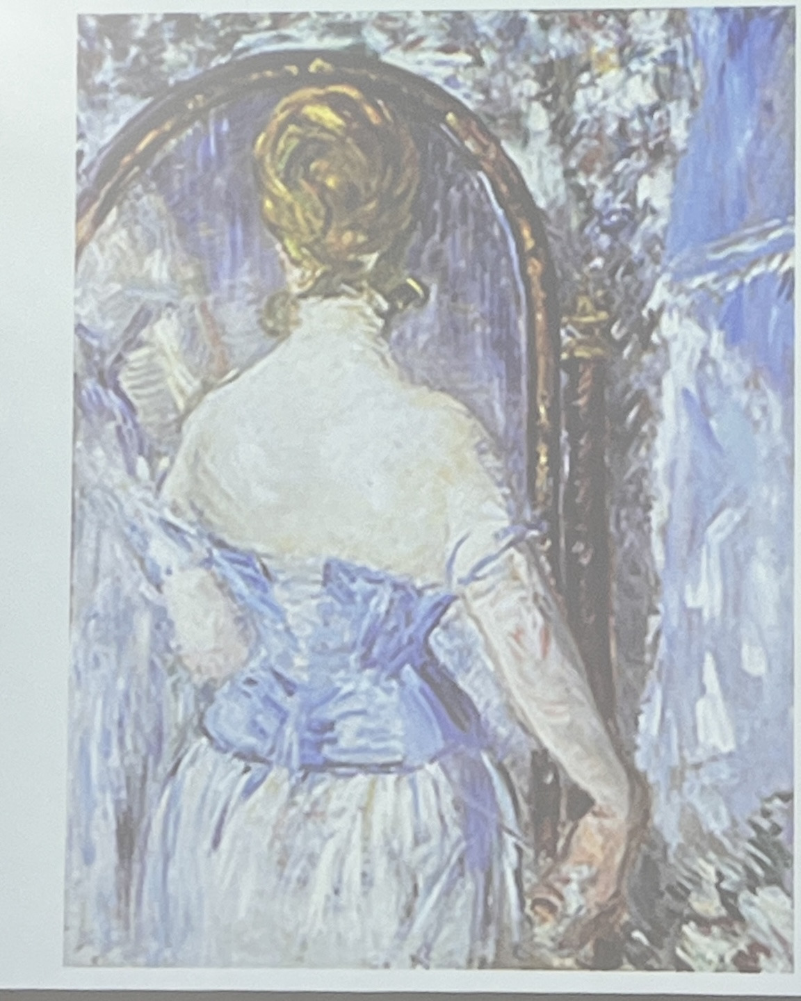 마네의 "거울 앞에서" 그림이다. 여인은 거울과 굉장히 가까이 위치하고 있어서 마치 거울 속의 여인인지 거울 밖의 여인인지 헷갈린다. 오른쪽 팔이 없었다면 구분하기 힘들었을 것이다. 거울 속에 비친 여인의 상도 뚜렷하지 않다. 어떤 각도에서 그렸는지 얼굴이 보이지 않고 거울의 구도는 잘려 있다. 여인이 입고 있는 코르셋은 거의 벗겨져 있다. 배경도 모호하다. 거울 앞의 여인은 무엇을 생각하고 있는지 궁금하다. 자신의 모습에 취해 있는 것일까. 인상주의 그림은 그 순간의 장면을 인상 깊게 포착하고 있다.