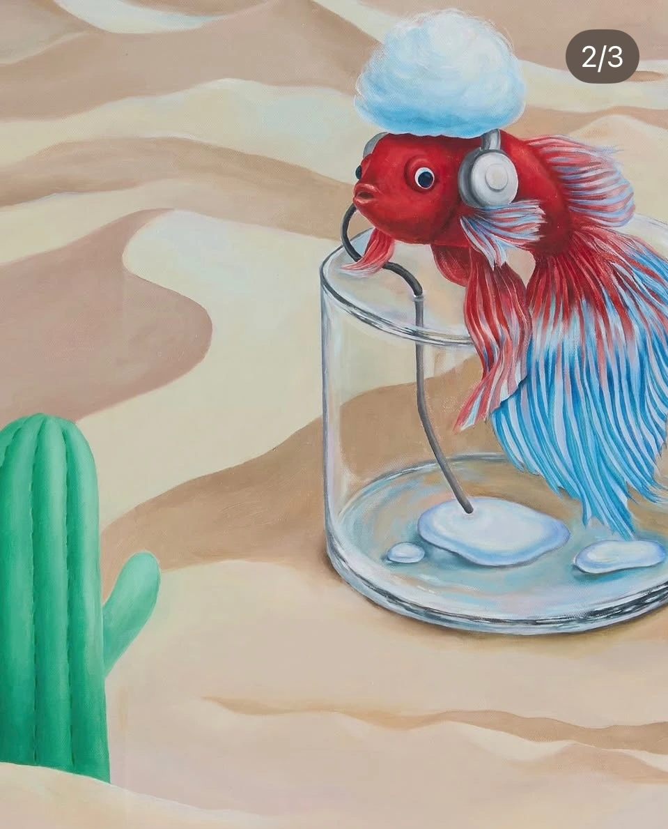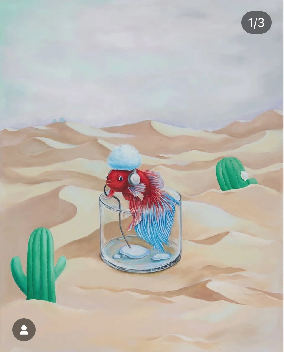 작가 심하진은 사막과 수조, 베타와 선인장이라는 상징적 오브제를 통해 서로 다른 세계가 맞닿는 순간의 감정과 관계의 온도를 탐구한다. 그의 회화 속 공간은 생명과 환경, 인간과 타자, 익숙함과 낯섦이 공존하는 '머무름과 불시착의 경계'에 놓여 있다.