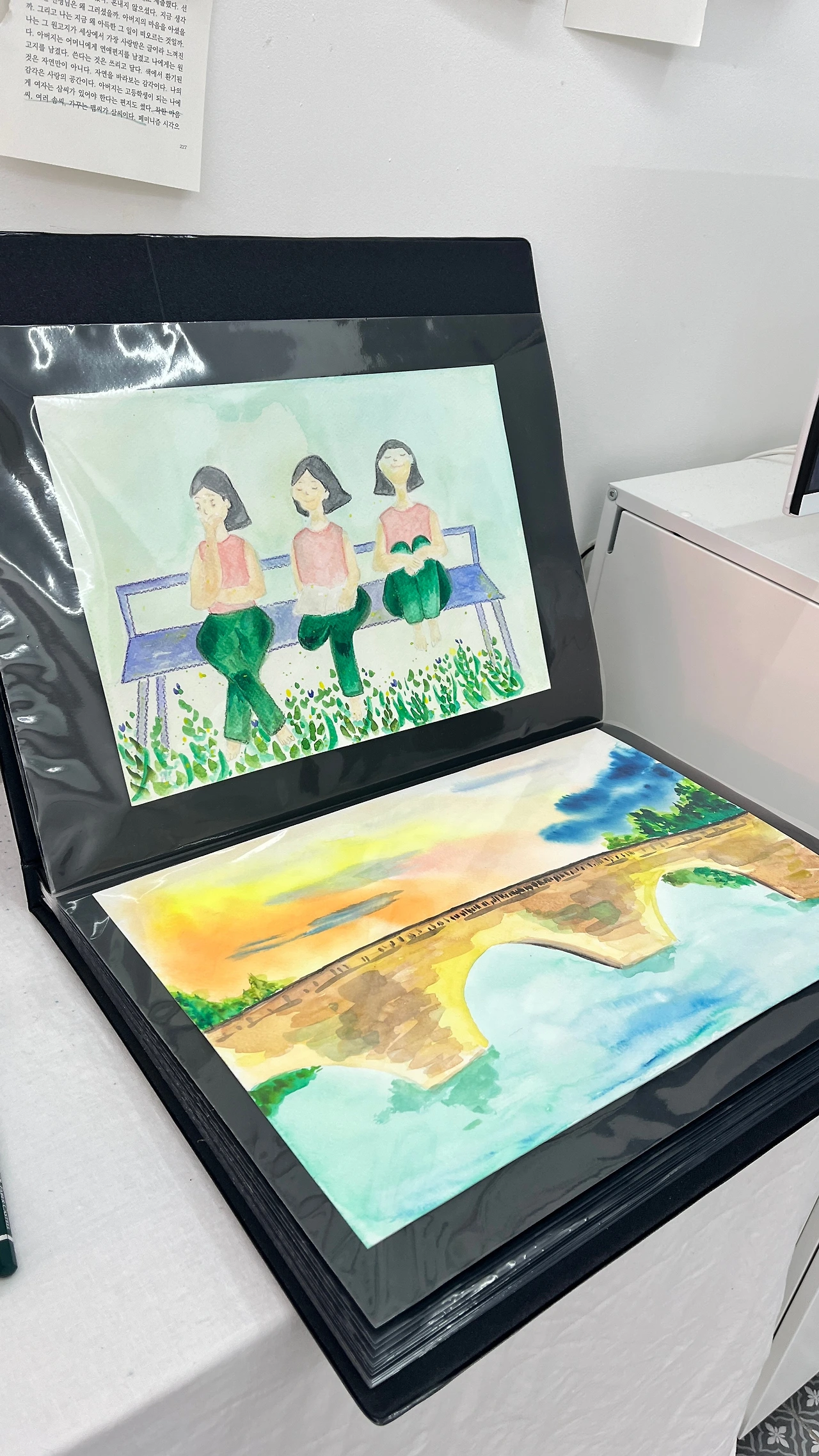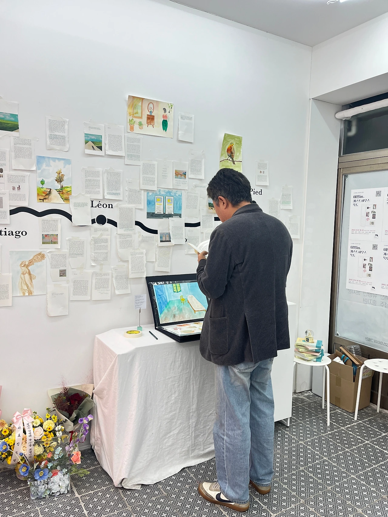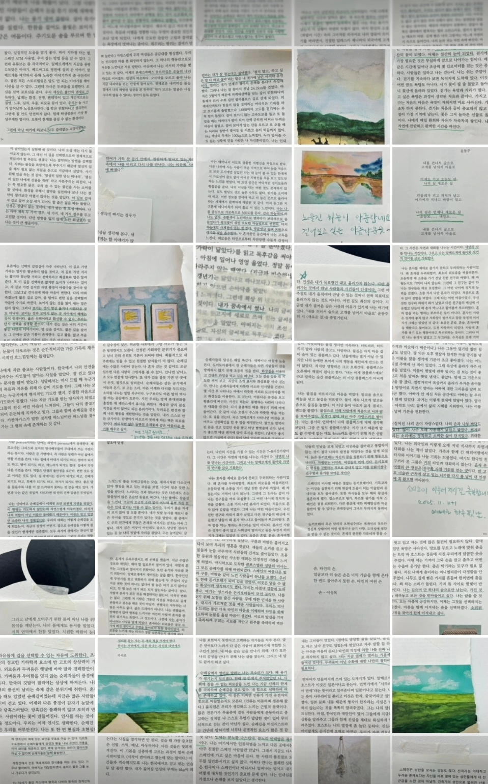물감은 서로에게 다가가 섞이면서 다른 빛을 만든다. 색은 이웃한 색을 만나 다양해진다. 색은 감정이다. 붉은 빛을 보고 있으면 내쉬는 숨도 붉어짐을 느낀다. 물감은 그런 숨소리까지 표현한다. 물이 남긴 다채로운 흔적은 단 하나의 기억이 된다. 관람객은 마음에 드는 한 구절, 그림 한 점을 선택해 책을 찢어 벽에 붙이는 퍼포먼스를 한다. 기억은 타인의 감정 속으로 들어가게 될 것이다.
