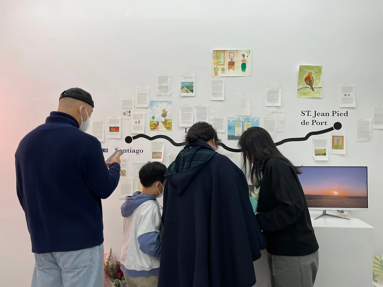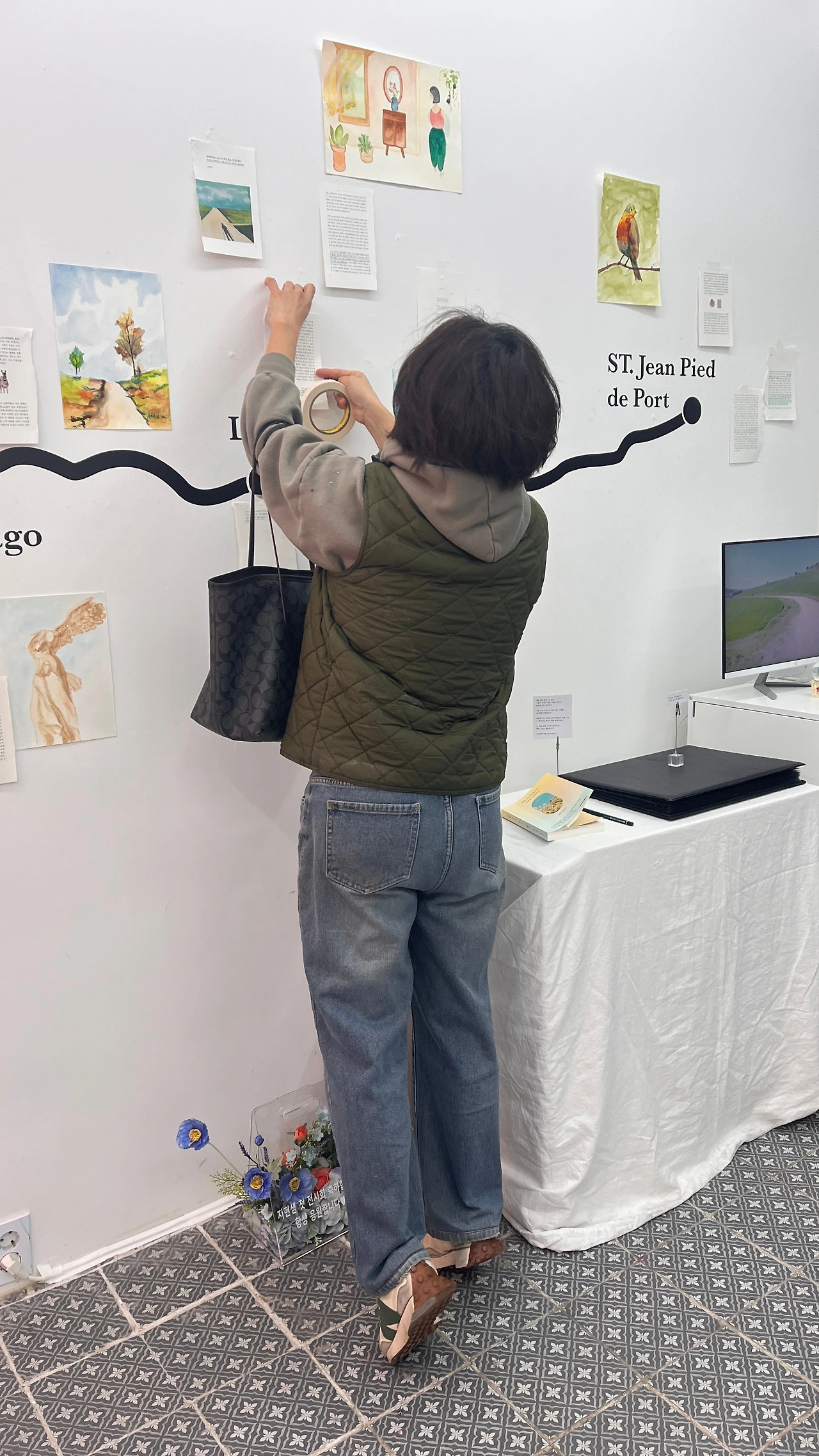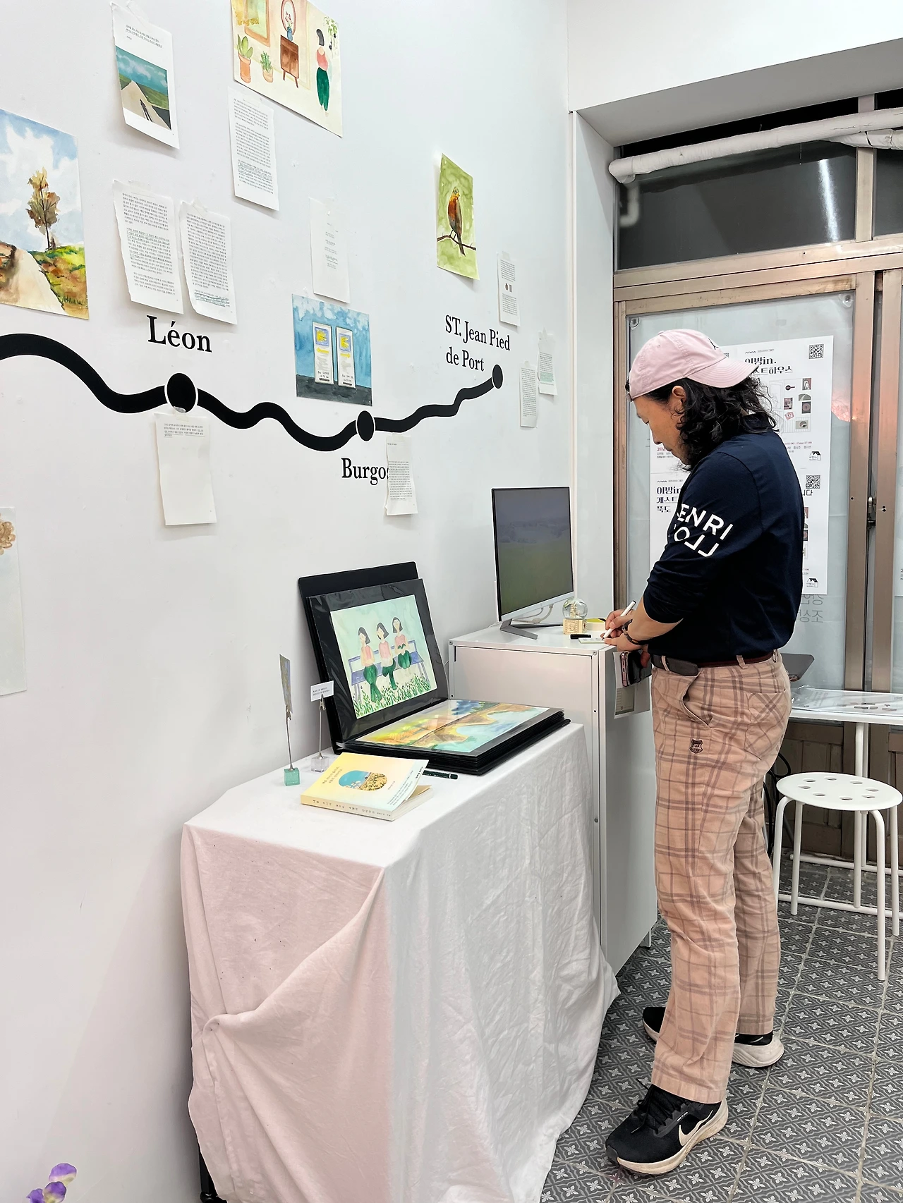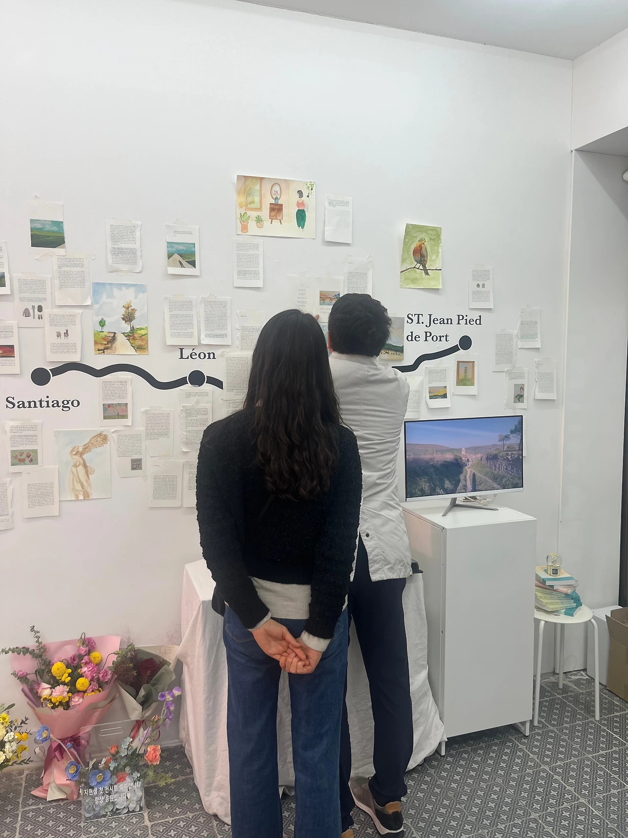 홍지현 작가는 글작가이다. 그는 그동안 자신의 책 표지를 직접 그려 출간했다. 이번에는 40점이 넘는 수채화를 그려 산티아고에서 느낀 감정을 글과 함께 표현했다. 수채화를 선택한 이유는 물이 충만하게 놀다가 남은 자국이 영원히 지워지지 않는 느낌과 닮았기 때문이다.