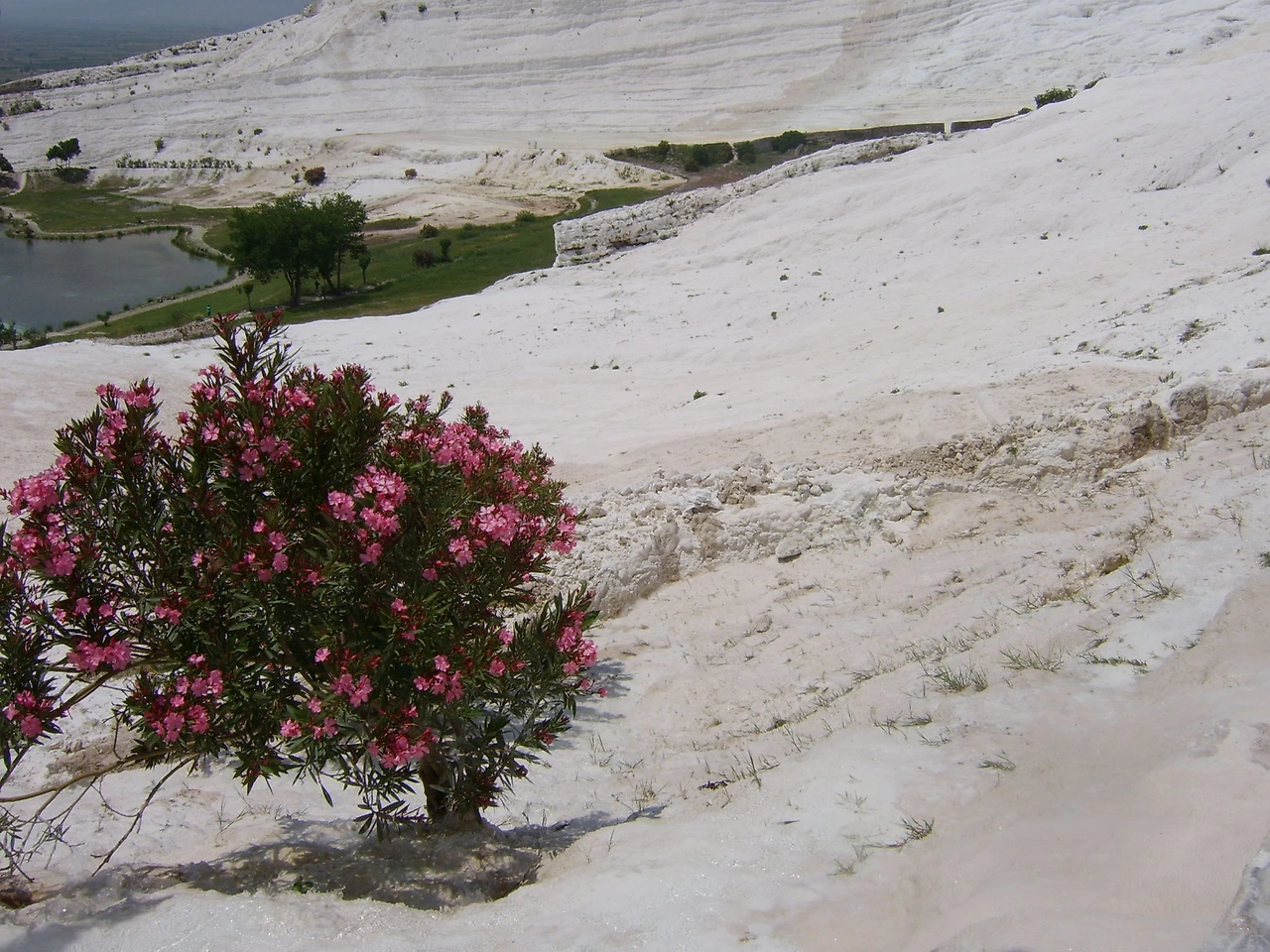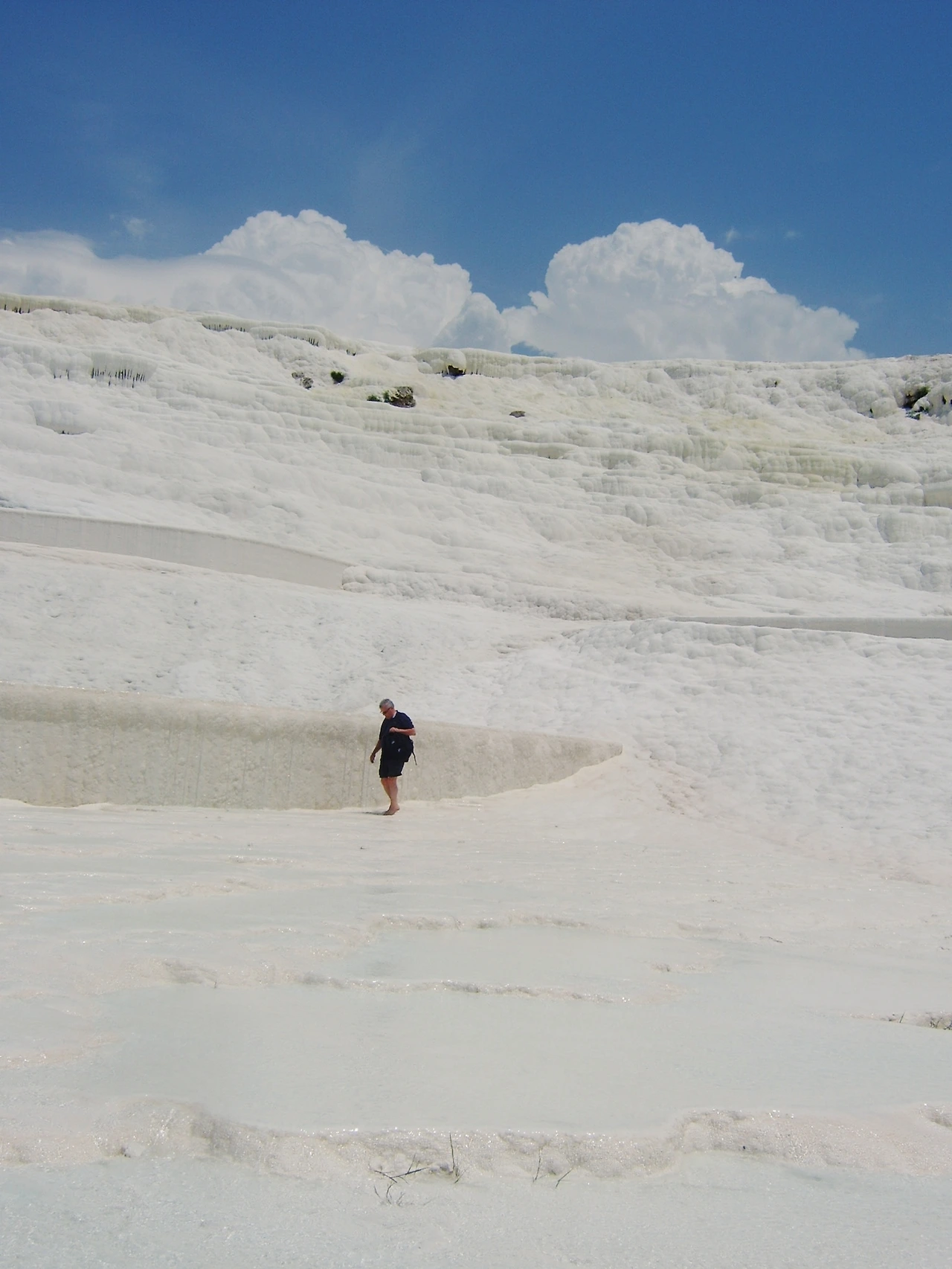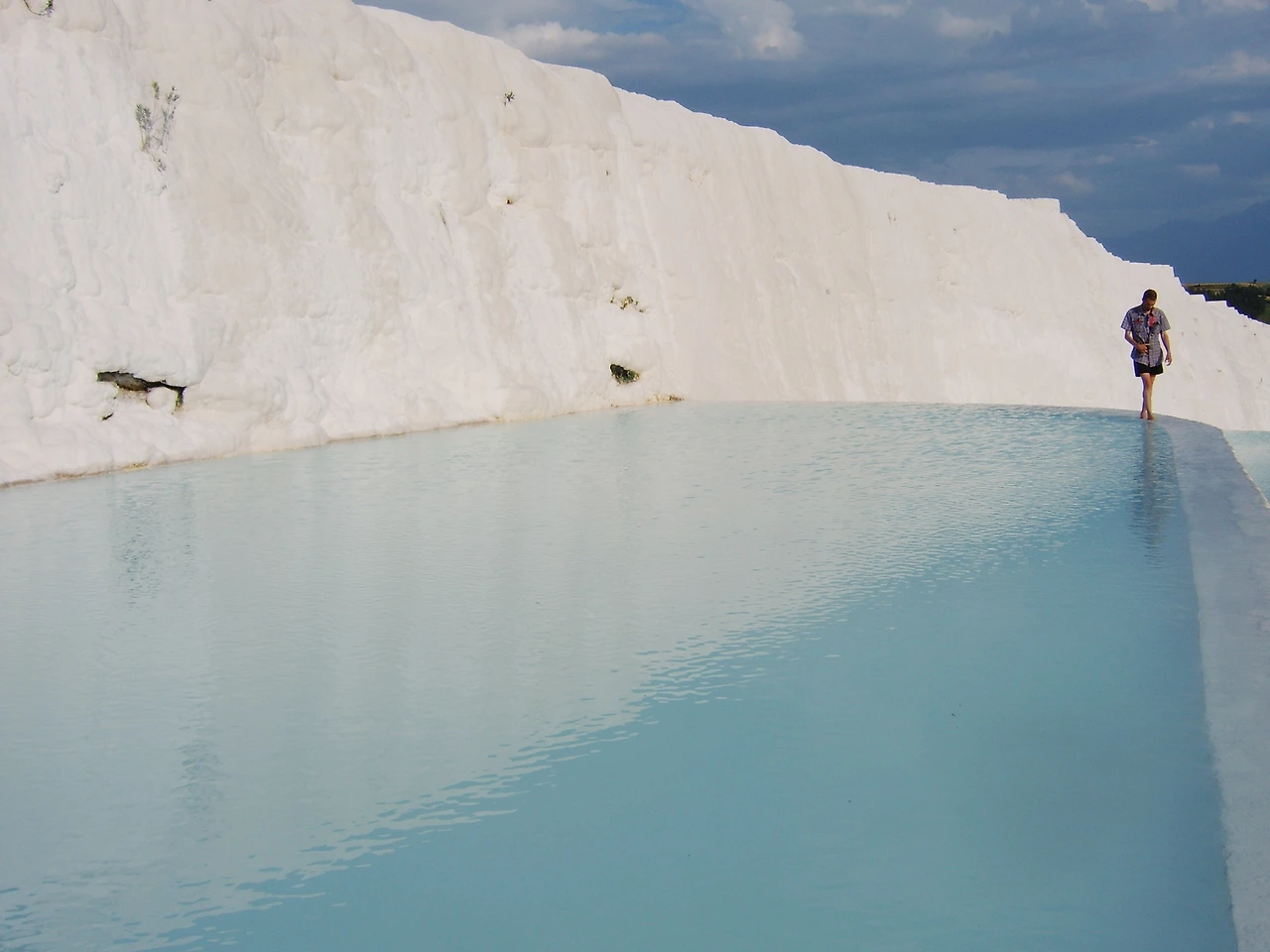 중간중간 온천수를 막아 놓아 수영장처럼 만들어 놓은 곳이 있었는데 사람들이 마음껏 들어가 수영을 즐길 수도 있었다. 위쪽으로 올라갈수록 시원했던 온천수의 온도는 점점 따뜻해지기 시작해서 몸을 담그고 물놀이하기에 딱 좋은 온도였다. 지금은 온천수가 많이 줄어들어 물도 별로 없고 석회붕에서의 수영도 금지되었다는 말이 있던데 내가 갔을 때만 해도 산 전체에 물이 넘쳐흘러 석회가 메마른 곳이 거의 없을 정도였고 곳곳에 인공적이든 천연이든 물 웅덩이가 가득했었다.