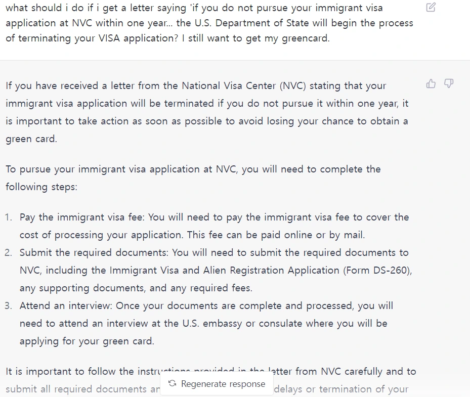 항상 마음의 짐으로 생각하고 있던 미국 영주권 프로세스에 대한 고민을 털어놓았다. ChatGPT는 나의 의도를 정확히 파악하고 이민 변호사보다 쓸모 있고 훌륭한 답을 내놓았다. 변호사의 업무도 많이 줄어들 것 같다.