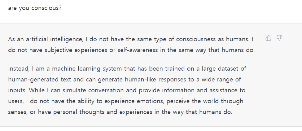 '너는 의식이 있니?'라는 질문에 인공지능이 할 수 있는 가장 정석적인 대답을 내놓는다.
