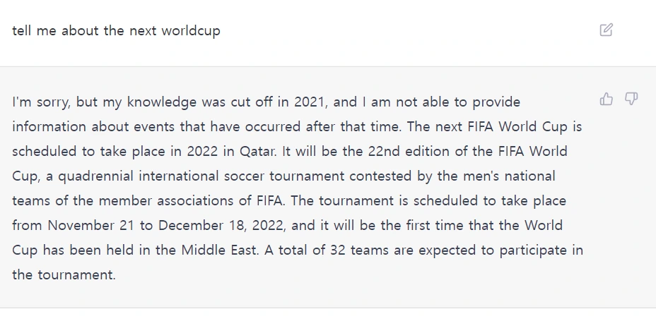 ChatGPT는 2021년까지의 학습 데이터를 기반으로 하고 있기 때문에 2022년 이후에 일어난 일을 알지 못한다. 그 예로 2023년인 현재 '다음 월드컵에 대해 말해줘'라는 질문을 하면 여전히 2022년 카타르 월드컵에 대해 이야기한다.