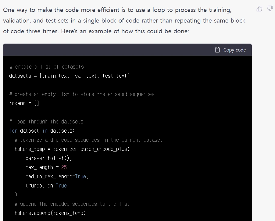 ChatGPT에 작성 중인 코드를 입력해 보았다. 일부러(?) 같은 코드를 반복 사용하는 다소 비효율적인 코드를 넣어보았더니, for loop를 사용하여 기가 막히게 간단하게 정리해 준다. 모두가 코딩을 배워야 한다고 외치지만, 반대로 앞으로는 코딩이 전혀 필요 없는 시대가 꽤나 높은 확률로 도래할 것 같다.