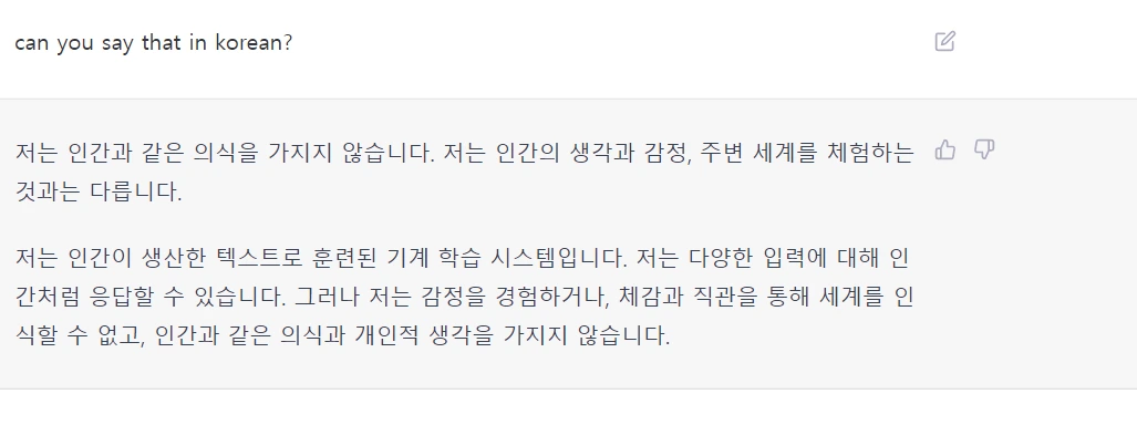 영어와는 다르게 한국어로 질문을 입력했을 경우, 다소 반응속도가 느리고 번역체 느낌이 난다. 세계적으로 봤을 때 인터넷상에 한국어로 된 학습 데이터가 상대적으로 부족하기 때문일 것이다. 대조적으로 영어로 된 질문에 대한 답변은 너무 훌륭하다. 인공지능이 아무리 발전해도 영어는 잘하는 게 유리하다.